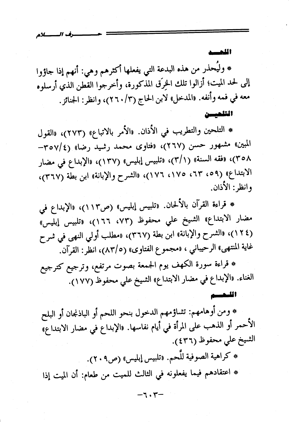 • قراءة القرآن بالألحان. "تلبيس إبليس" (ص 113)، "الإبداع في مضار الإبتداع" الشيخ علي محفوظ (73، 166)، "تلبيس إبليس" (124)، "الشرح والإبانة" ابن بطة (367)، "مطلب أولي النهى في شرح غاية المنتهى" الرحيباني، "مجموع الفتاوى" (5/ 83)، انظر: القرآن.
