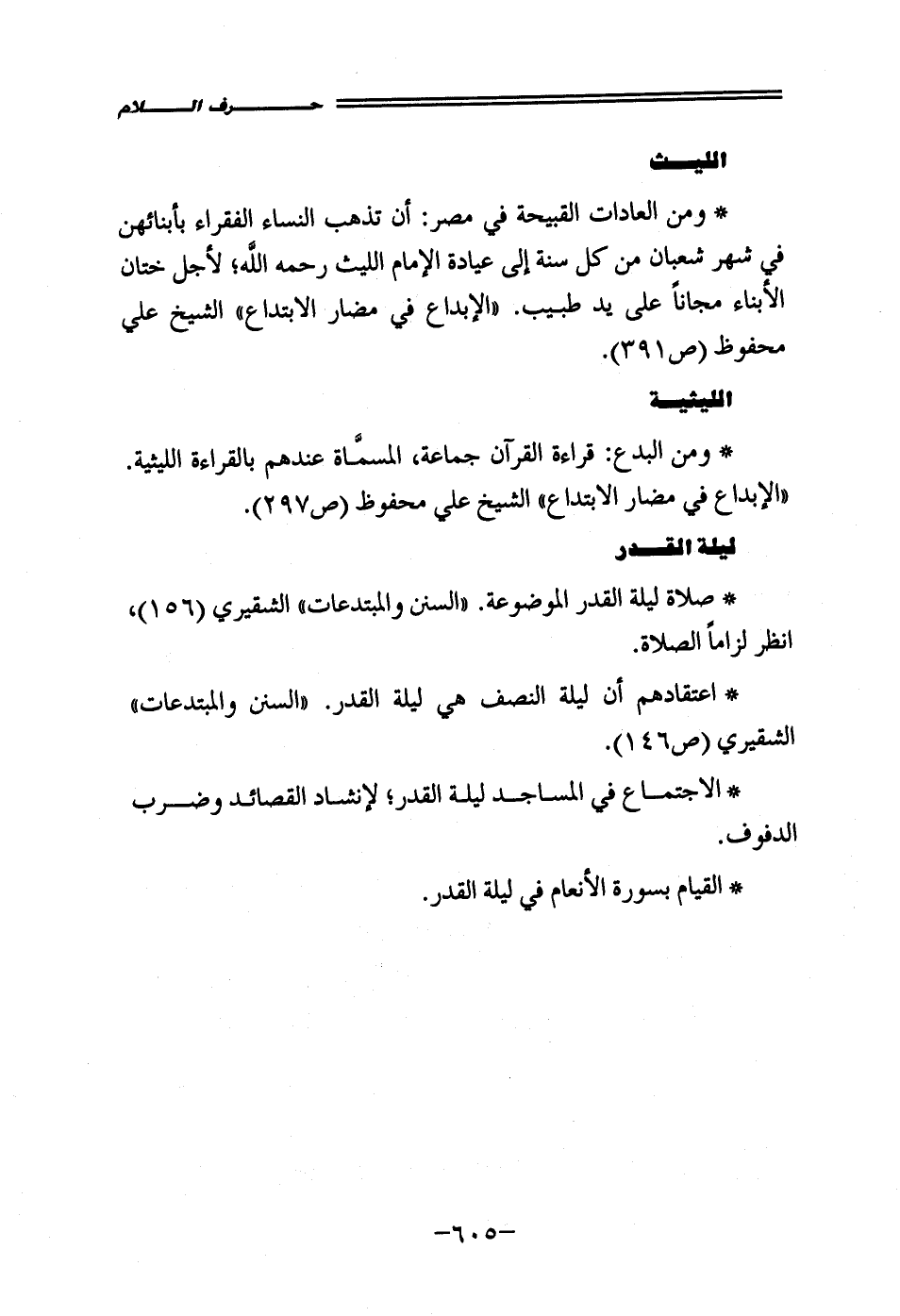 • صلاة ليلة القدر الموضوعة. "السنن والمبتدعات" الشقيري (156)، انظر لزامًا الصلاة.