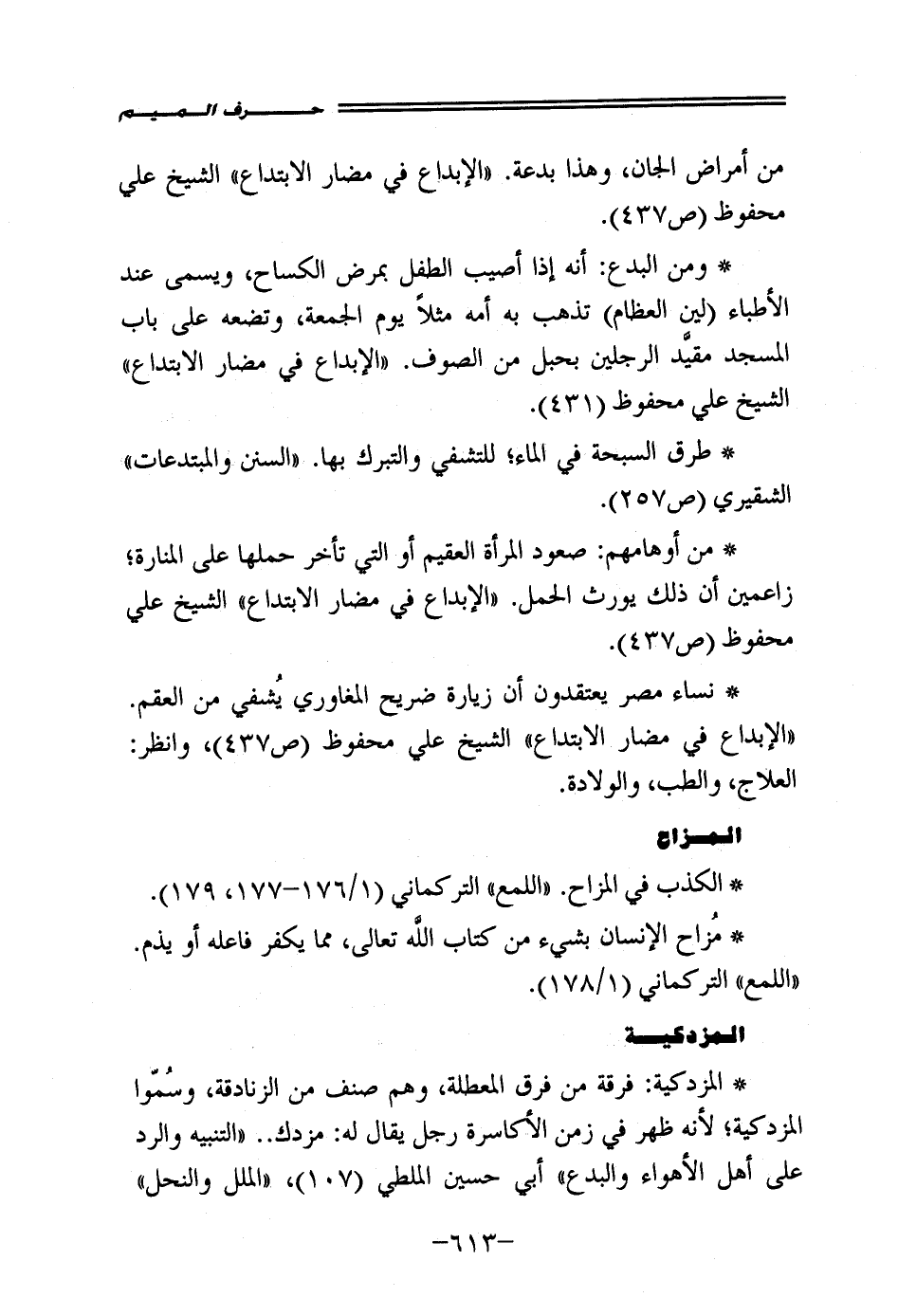 • ومن البدع: أنه إذا أصيب الطفل بمرض الكساح، ويسمى عند الأطباء (لين العظام) تذهب به أمه مثلًا يوم الجمعة، وتضعه على باب المسجد مقيَّد الرجلين بحبل من الصوف. "الإبداع في مضار الإبتداع" الشيخ علي محفوظ (431).