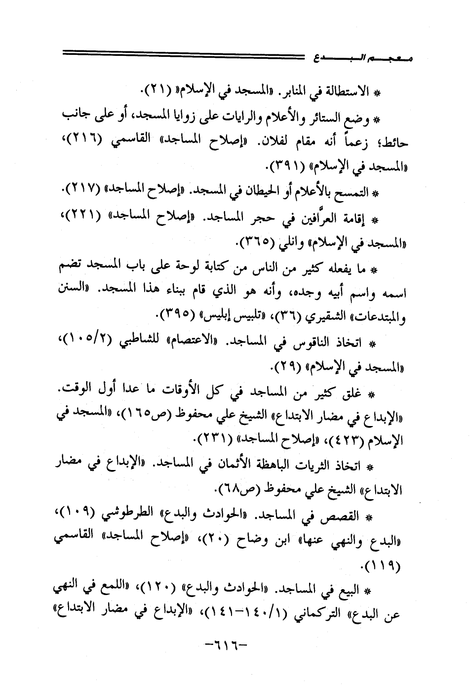 • البيع في المساجد. "الحوادث والبدع" (120)، "اللمع في النهي عن البدع" التركماني (1/ 140 - 141)، "الإبداع في مضار الإبتداع"