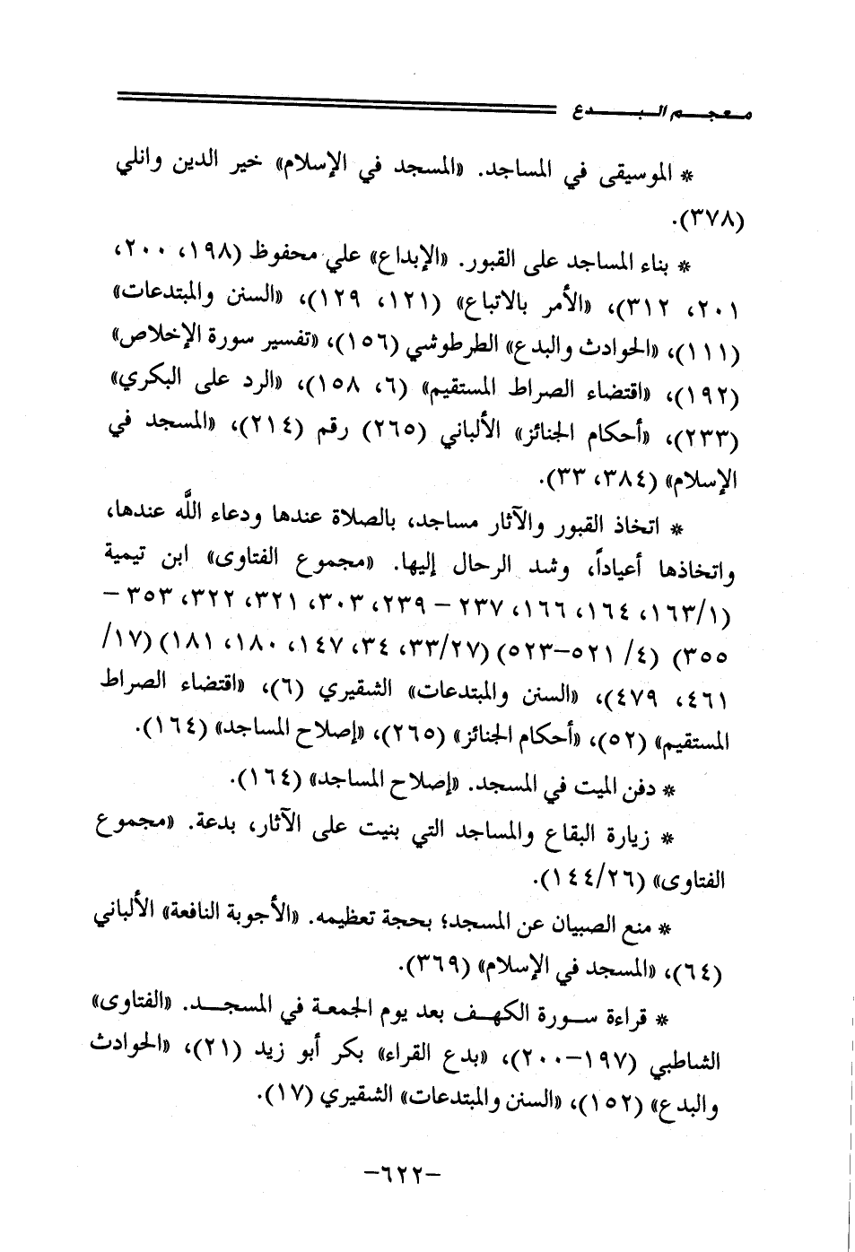 • بناء المساجد على القبور. "الإبداع" علي محفوظ (198، 200، 201، 312)، "الأمر بالإتباع" (121، 129)، "السنن والمبتدعات" (111)، "الحوادث والبدع" الطرطوشي (156)، "تفسير سورة الإخلاص" (192)، "اقتضاء الصراط المستقيم" (6، 158)، "الرد على البكري" (233)، "أحكام الجنائز" الألباني (265) رقم (4 21)، "المسجد في الإسلام" (384، 33).