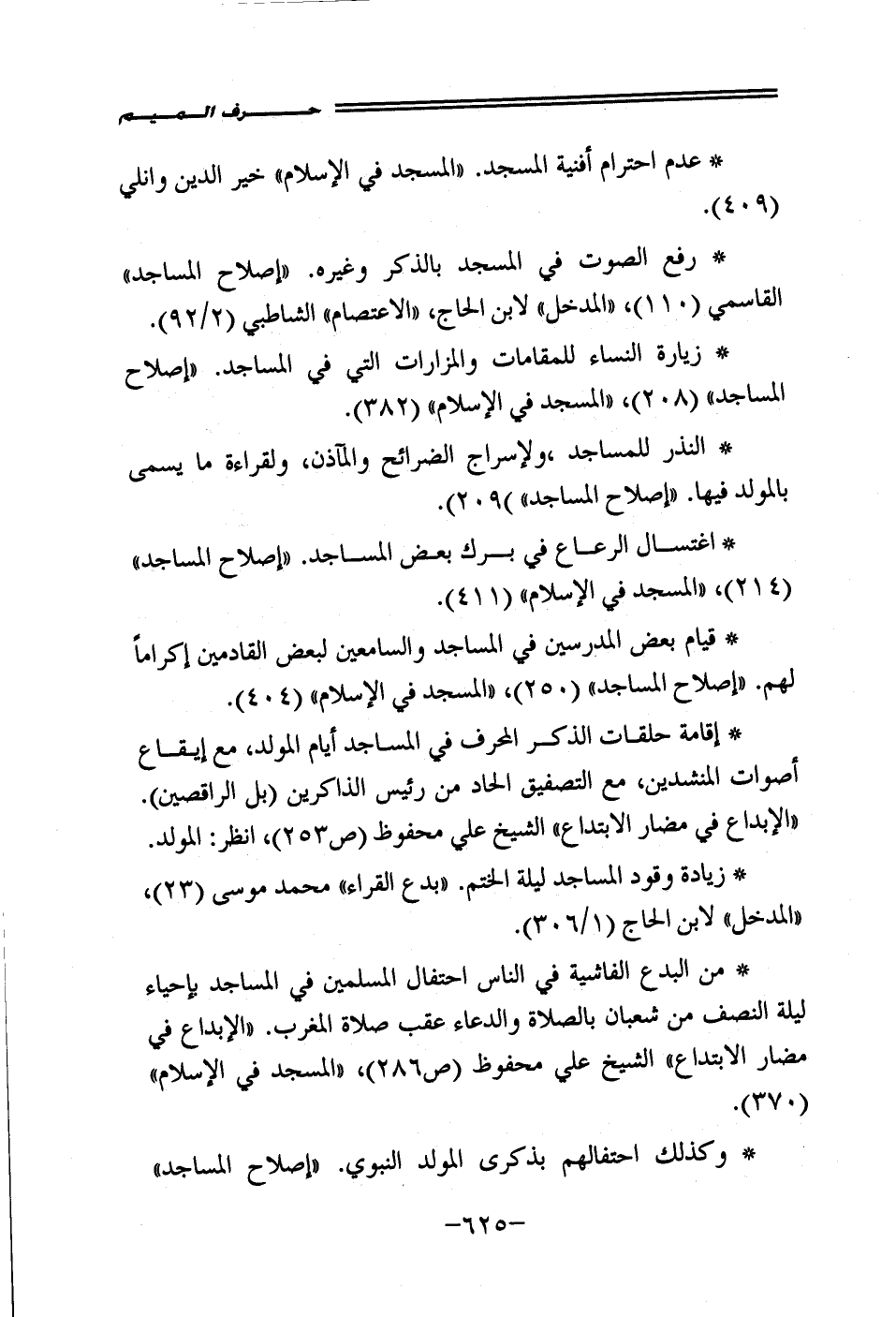 • اغتسال الرعاع في برك بعض المساجد. "إصلاح المساجد" (214)، "المسجد في الإسلام" (411).