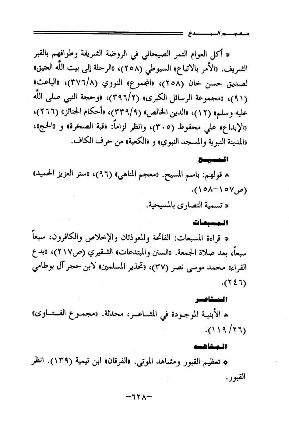 • أكل العوام التمر الصيحاني في الروضة الشريفة وطوافهم بالقبر الشريف. "الأمر بالإتباع" السيوطي (258)، "الرحلة إلى بيت الله العتيق" لصديق حسن خان (258)، "المجموع" النووي (376/ 8)، "الباعث" (91)، "مجموعة الرسائل الكبرى" (2/ 396)، "وحجة النبي - صلى الله عليه وسلم -" (12)، "الدين الخالص" (9/ 339)، "أحكام الجنائز" (266)، "الإبداع" علي محفوظ (305)، وانظر لزامًا: "قبة الصخرة" و "الحج"، "المدينة النبوية والمسجد النبوي" و"الكعبة" من حرف الكاف.
