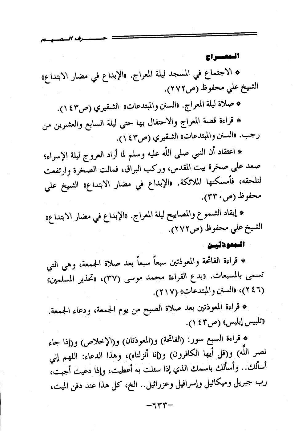 • الاجتماع في المسجد ليلة المعراج. "الإبداع في مضار الإبتداع" الشيخ علي محفوظ (ص 272).