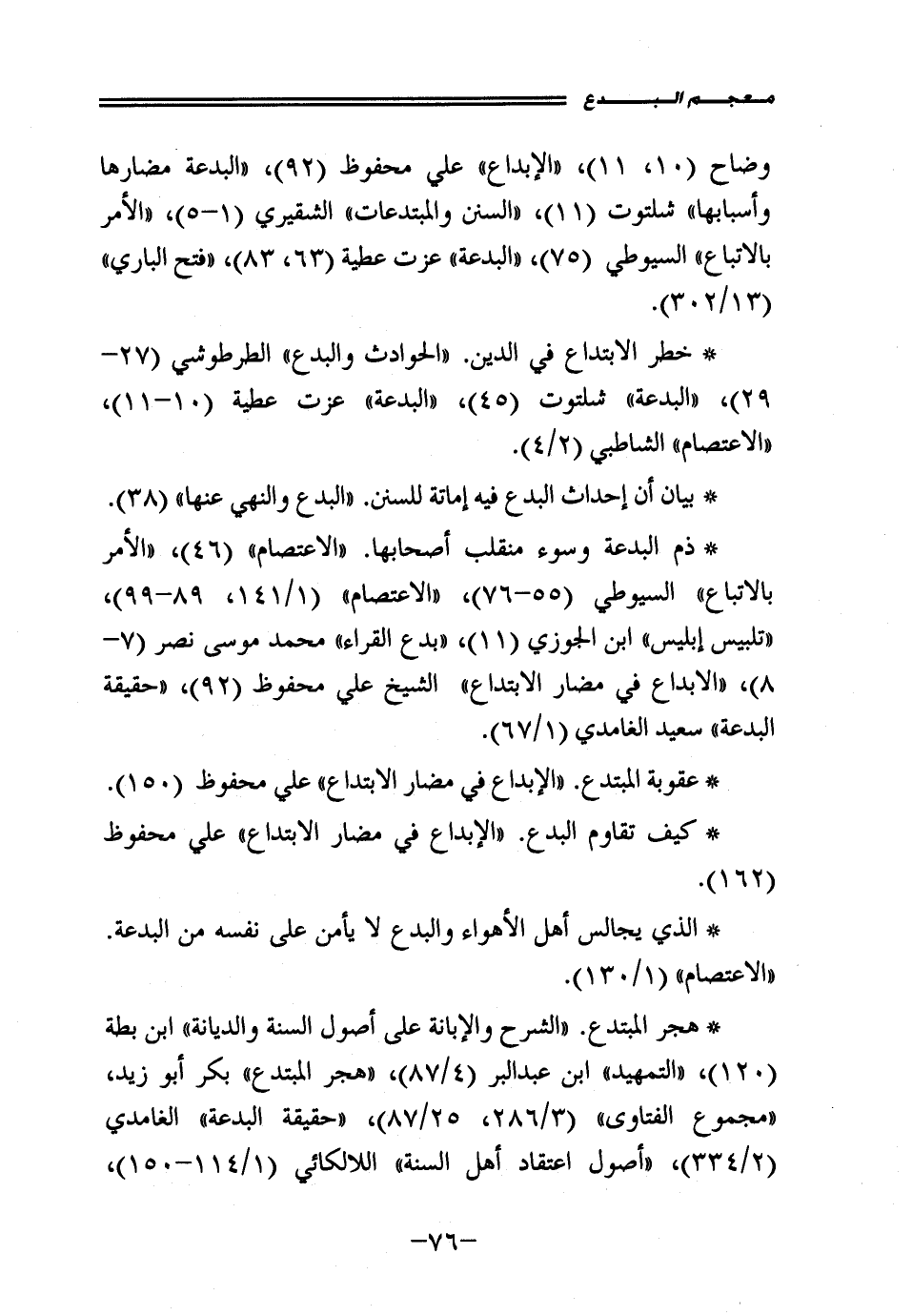 وضاح (10، 11)، "الإبداع" علي محفوظ (92)، "البدعة مضارها وأسبابها" شلتوت (11)، "السنن والمبتدعات" الشقيري (1 - 5)، "الأمر بالاتباع" السيوطي (75)، "البدعة" عزت عطية (63، 83)، "فتح الباري" (13/ 302).