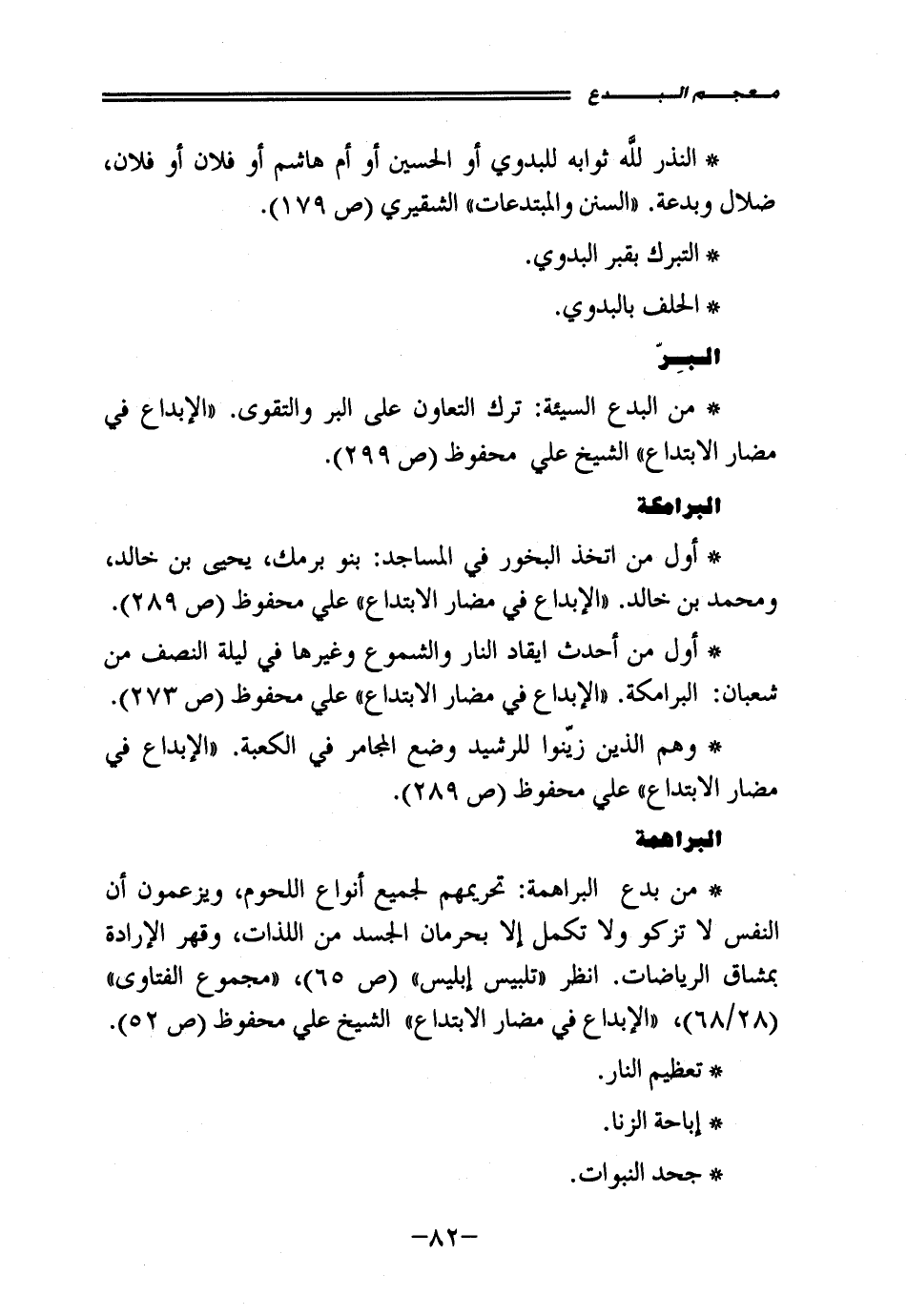 • النذر لله ثوابه للبدوى أو الحسين أو أم هاشم أو فلان أو فلان، ضلال وبدعة. "السنن والمبتدعات" الشقيري (ص 179).