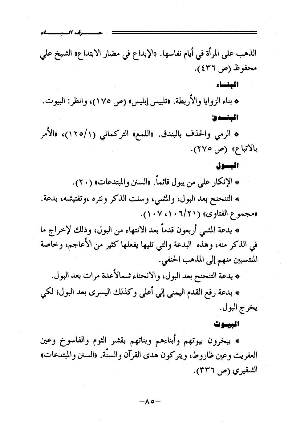 • الإنكار على من يبول قائماً. "السنن والمبتدعات" (20).