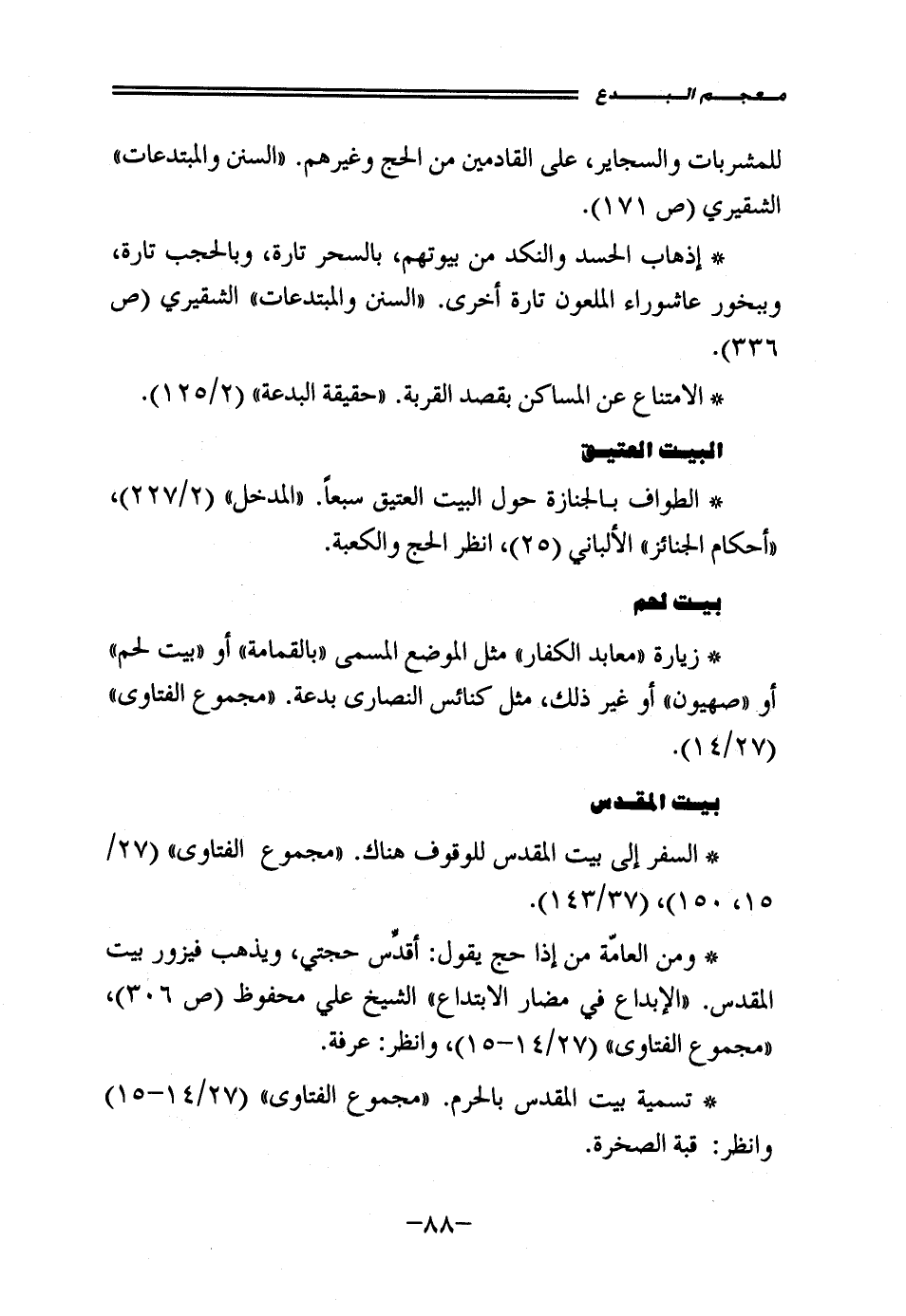 • ومن العامّة من إذا حج يقول: أقدِّس حجتي، ويذهب فيزور بيت المقدس. "الإبداع فى مضار الابتداع" الشيخ علي محفوظ (ص 306)، "مجموع الفتاوى" (27/ 14 - 15)، وانظر: عرفة.
