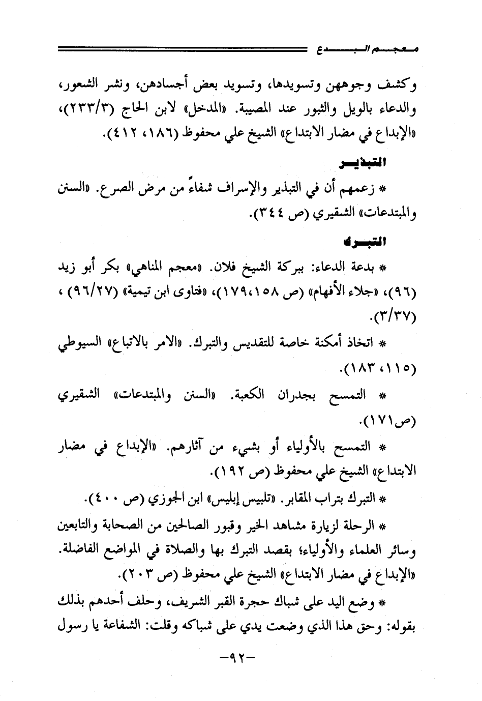 • بدعة الدعاء: ببركة الشيخ فلان. "معجم المناهي" بكر أبو زيد (96)، "جلاء الأفهام" (ص 179،158)، "فتاوى ابن تيمية" (27/ 96)، (37/ 3).
