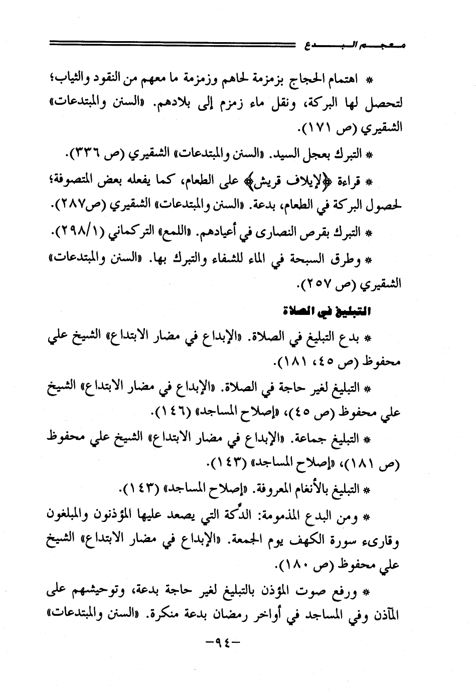 • بدع التبليغ في الصلاة. "الإبداع في مضار الإبتداع" الشيخ علي محفوظ (ص 45، 181).