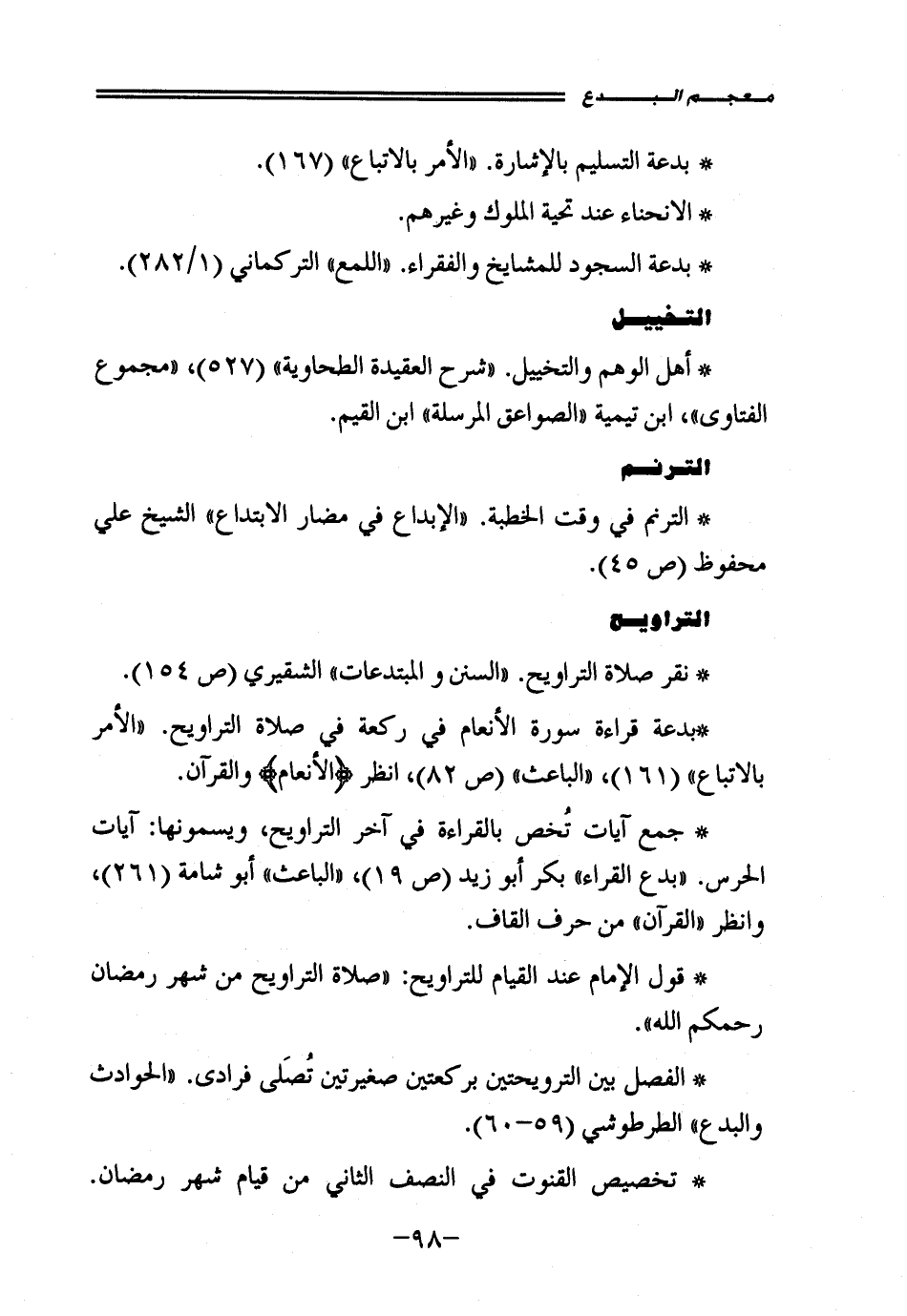 • نقر صلاة التراويح. "السنن والمبتدعات" الشقيري (ص 154).