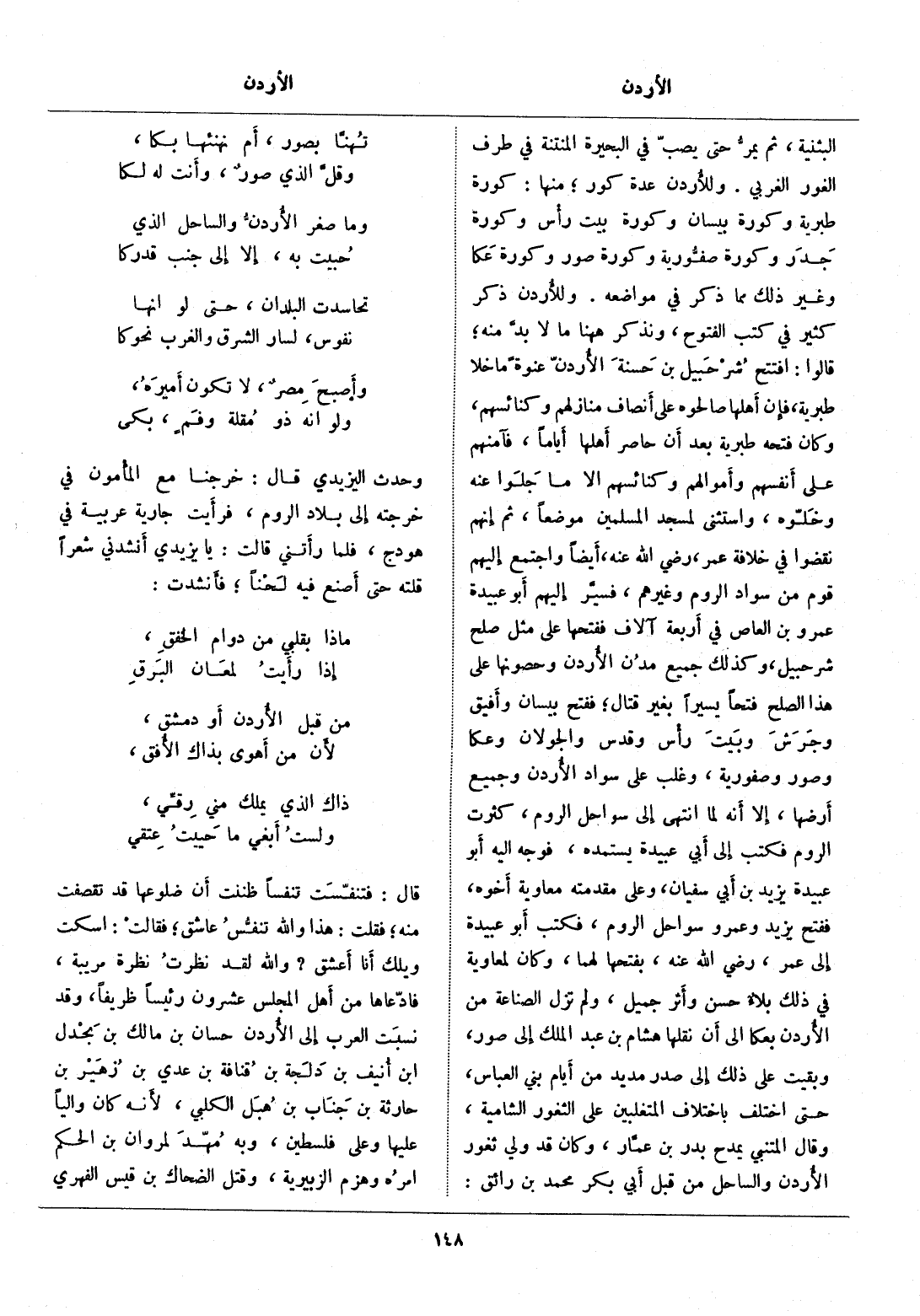 البثنية، ثم يمرّ حتى يصبّ في البحيرة المنتنة في طرف الغور الغربي. وللأردن عدة كور، منها: كورة طبرية وكورة بيسان وكورة بيت رأس وكورة جدر وكورة صفّورية وكورة صور وكورة عكا وغير ذلك مما ذكر في مواضعه. وللأردن ذكر كثير في كتب الفتوح، ونذكر ههنا ما لا بدّ منه، قالوا: افتتح شرحبيل بن حسنة الأردنّ عنوة ما خلا طبرية، فإن أهلها صالحوه على أنصاف منازلهم وكنائسهم، وكان فتحه طبرية بعد أن حاصر أهلها أياما، فآمنهم على أنفسهم وأموالهم وكنائسهم الا ما جلوا عنه وخلّوه، واستثنى لمسجد المسلمين موضعا، ثم إنهم نقضوا في خلافة عمر، رضي الله عنه، أيضا واجتمع إليهم قوم من سواد الروم وغيرهم، فسيّر إليهم أبو عبيدة عمرو بن العاص في أربعة آلاف ففتحها على مثل صلح شرحبيل، وكذلك جميع مدن الأردن وحصونها على هذا الصلح فتحا يسيرا بغير قتال، ففتح بيسان وأفيق وجرش وبيت رأس وقدس والجولان وعكا وصور وصفورية، وغلب على سواد الأردن وجميع أرضها، إلا أنه لما انتهى إلى سواحل الروم، كثرت الروم فكتب إلى أبي عبيدة يستمده، فوجه اليه أبو عبيدة يزيد بن أبي سفيان، وعلى مقدمته معاوية أخوه، ففتح يزيد وعمرو سواحل الروم، فكتب أبو عبيدة إلى عمر، رضي الله عنه، بفتحها لهما، وكان لمعاوية في ذلك بلاء حسن وأثر جميل، ولم تزل الصناعة من الأردن بعكا الى أن نقلها هشام بن عبد الملك إلى صور، وبقيت على ذلك إلى صدر مديد من أيام بني العباس، حتى اختلف باختلاف المتغلبين على الثغور الشامية، وقال المتنبي يمدح بدر بن عمّار، وكان قد ولي ثغور الأردن والساحل من قبل أبي بكر محمد بن رائق: تهنّا بصور، أم نهنئها بكا،