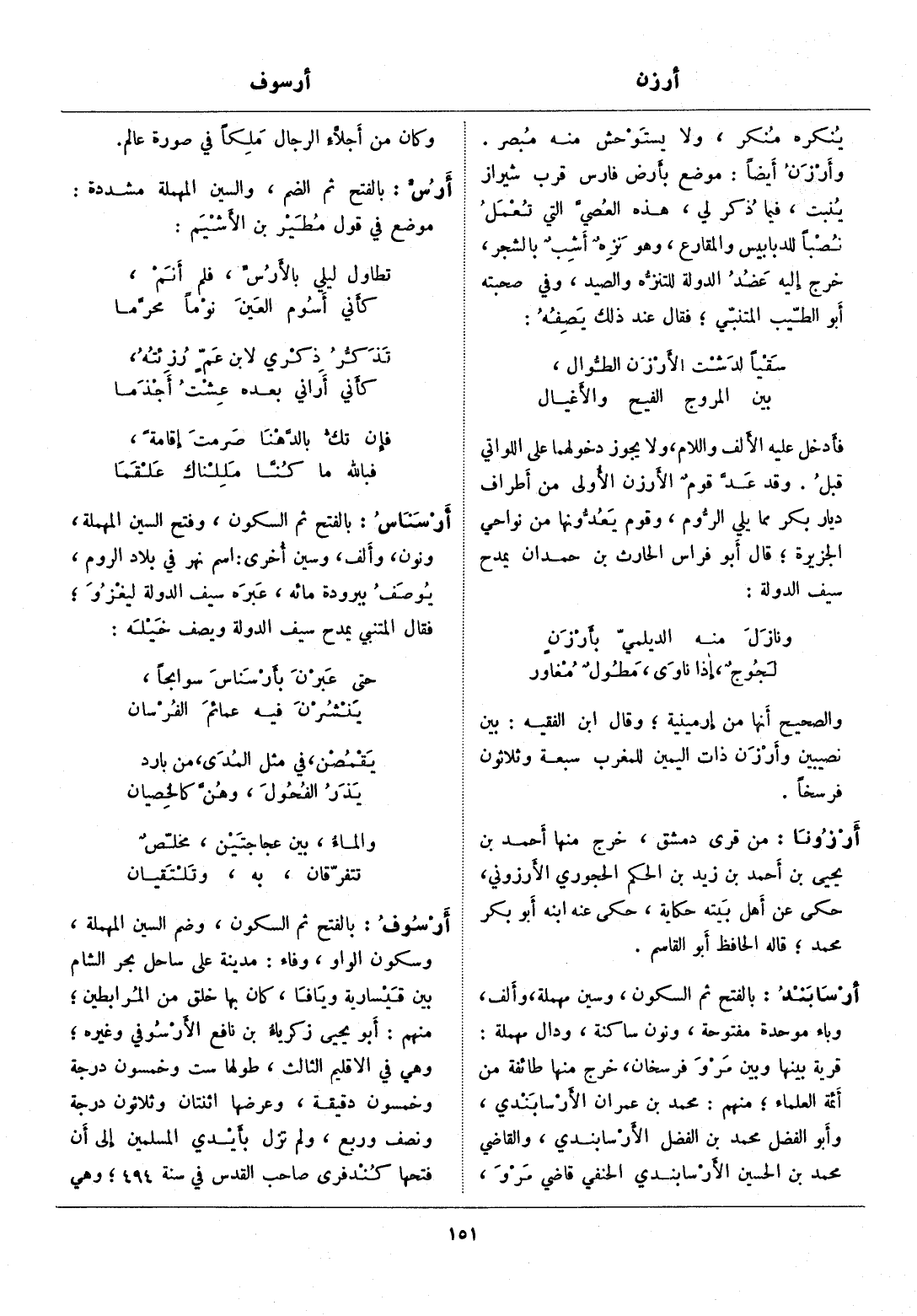 فأدخل عليه الألف واللام، ولا يجوز دخولهما على اللواتي قبل. وقد عدّ قوم الأرزن الأولى من أطراف ديار بكر مما يلي الرّوم، وقوم يعدّونها من نواحي الجزيرة، قال أبو فراس الحارث بن حمدان يمدح سيف الدولة: