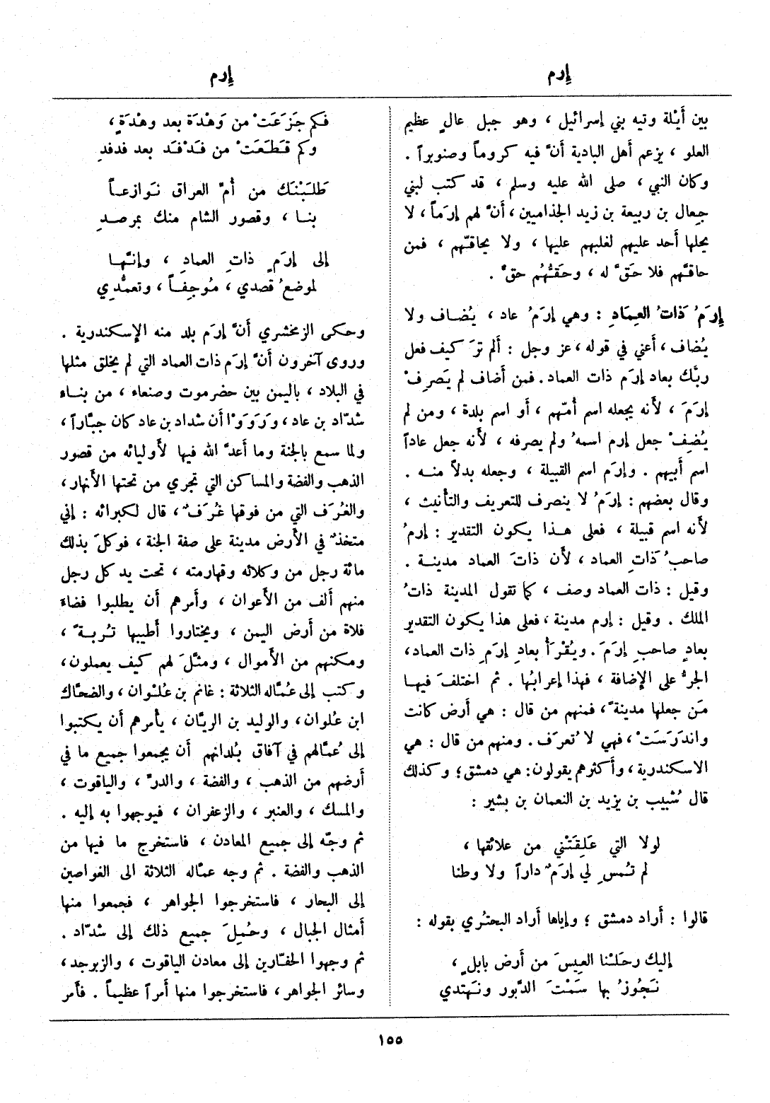 وهي إرم عاد، يضاف ولا يضاف، أعني في قوله، عز وجل: أَلَمْ تَرَ كَيْفَ فَعَلَ رَبُّكَ بِعادٍ إِرَمَ ذاتِ الْعِمادِ 89: 6- 7. فمن أضاف لم يصرف إرم، لأنه يجعله اسم أمّهم، أو اسم بلدة، ومن لم يضف جعل إرم اسمه ولم يصرفه، لأنه جعل عادا اسم أبيهم. وإرم اسم القبيلة، وجعله بدلا منه.