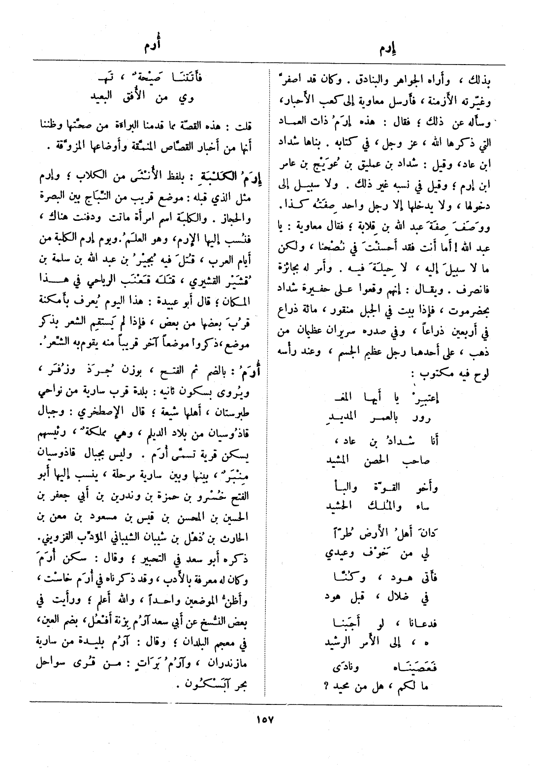بذلك، وأراه الجواهر والبنادق. وكان قد اصفرّ وغيّرته الأزمنة، فأرسل معاوية إلى كعب الأحبار، وسأله عن ذلك، فقال: هذه إرم ذات العماد التي ذكرها الله، عز وجل، في كتابه. بناها شداد ابن عاد، وقيل: شداد بن عمليق بن عويج بن عامر ابن إرم، وقيل في نسبه غير ذلك. ولا سبيل إلى دخولها، ولا يدخلها إلا رجل واحد صفته كذا.