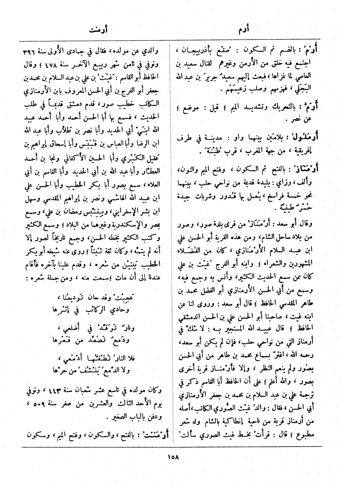 وقال أبو سعد: أرمناز من قرى بلدة صور، وصور من بلاد ساحل الشام، ومن هذه القرية أبو الحسن علي ابن عبد السلام الأرمنازي، كان من الفضلاء المشهورين والشعراء، وابنه أبو الفرج غيث بن علي كان ممن سمع الحديث الكثير، وأنس به وجمع فيه، وسمع من أبي الحسن الأرمنازي أبو الفضل محمد بن طاهر المقدسي الحافظ، قال أبو سعد: وروى لنا عن ابنه غيث، صاحبنا أبو الحسن علي بن الحسن الدمشقي الحافظ، قال عبيد الله المستجير به: لا شكّ في أرمناز التي من نواحي حلب، فإن لم يكن أبو سعد، رحمه الله، اغترّ بسماع محمد بن طاهر من أبي الحسن بصور ولم ينعم النظر، وإلا فأرمناز قرية أخرى بصور، والله أعلم، على أن الحافظ أبا القاسم ذكر في ترجمة علي بن عبد السلام بن محمد بن جعفر الأرمنازي أبي الحسن، فقال: والد غيث الصّوري الكاتب، أصله من أرمناز قرية من ناحية أنطاكية بالشام وله شعر مطبوع، قال: قرأت بخط غيث الصوري سألت والدي عن مولده، فقال في جمادى الأولى سنة 396 وتوفي في ثامن شهر ربيع الآخر سنة 478، وقال الحافظ أبو القاسم: غيث بن علي بن عبد السلام بن محمد بن جعفر أبو الفرج بن أبي الحسن المعروف بابن الأرمنازي الكاتب خطيب صور، قدم دمشق قديما في طلب الحديث، فسمع بها أبا الحسن أحمد وأبا أحمد عبيد الله ابني أبي الحديد وأبا نصر بن طلاب وأبا عبد الله ابن الرضا وأبا العباس بن قبيس وأبا إسحاق إبراهيم بن عقيل الكبري وأبا الحسين الأكفاني ونجا بن أحمد العطّار وأبا عبد الله بن أبي الحديد وأبا القاسم بن أبي العلاء، سمع بصور أبا بكر الخطيب وأبا الحسن علي ابن عبيد الله الهاشمي ونصر بن إبراهيم المقدسي وسهل ابن بشر الإسفرايني، وبتنيّس رمضان بن علي، وسمع بمصر والإسكندرية وغيرهما من البلاد، وسمع الكثير وكتب الكثير بخطه الحسن، وجمع تاريخا لصور إلا أنه لم يتمّه، وكان ثقة ثبتا، روى عنه شيخه أبو بكر الخطيب بيتين من شعره، وقدم علينا بآخره فأقام عندنا إلى أن مات، سمعت منه، ومن جملة شعره: