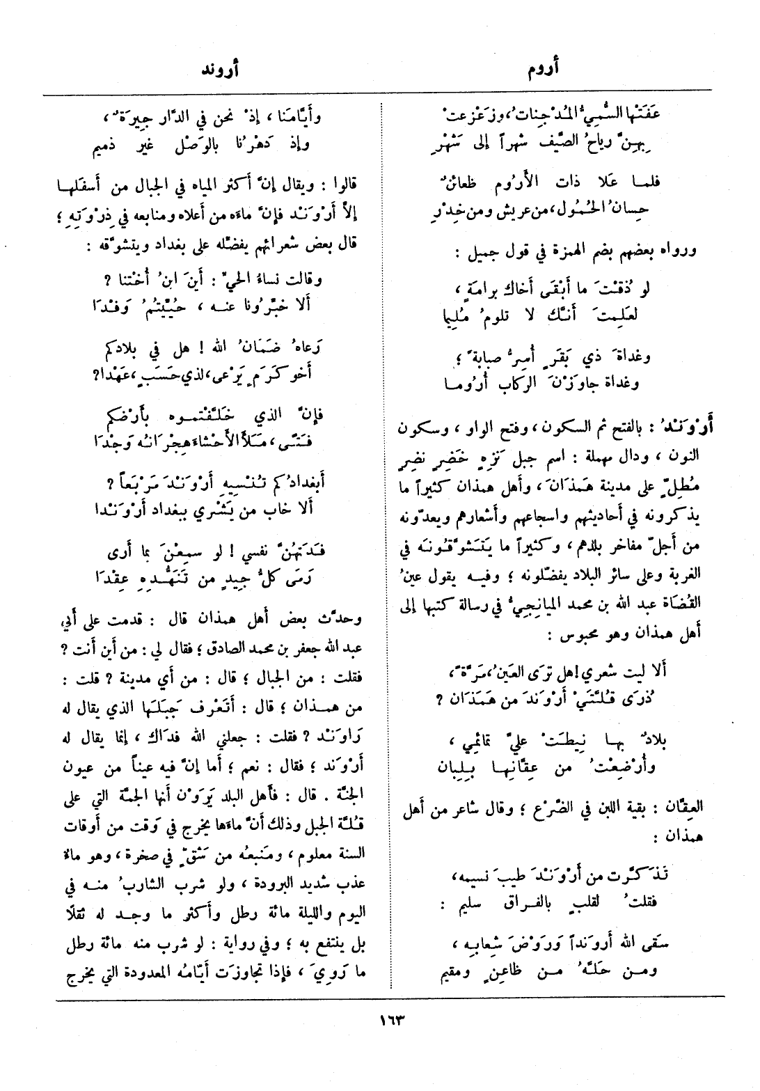 قالوا: ويقال إنّ أكثر المياه في الجبال من أسفلها إلّا أروند فإنّ ماءه من أعلاه ومنابعه في ذروته، قال بعض شعرائهم يفضّله على بغداد ويتشوّقه: