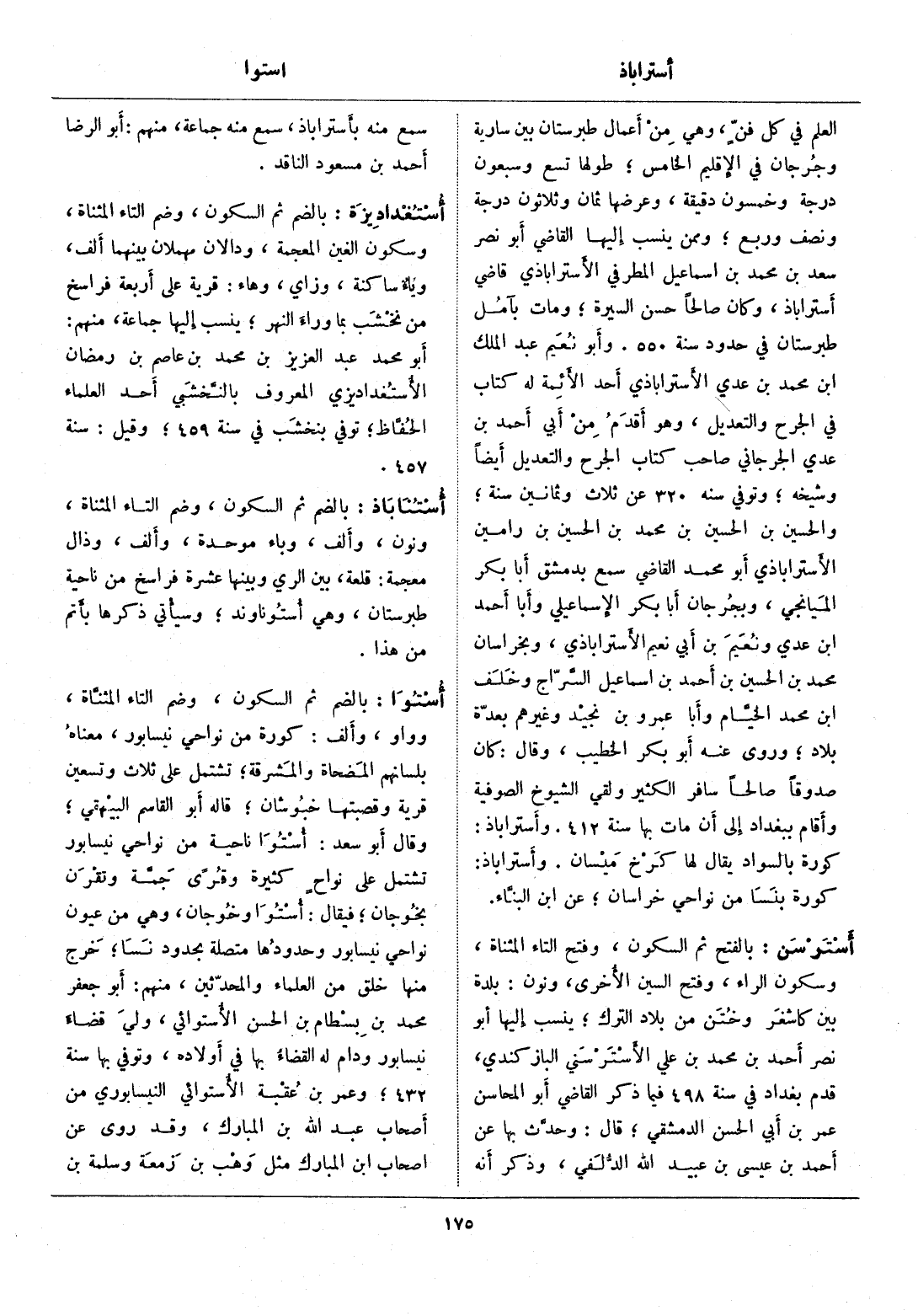 العلم في كل فنّ، وهي من أعمال طبرستان بين سارية وجرجان في الإقليم الخامس، طولها تسع وسبعون درجة وخمسون دقيقة، وعرضها ثمان وثلاثون درجة ونصف وربع، وممن ينسب إليها القاضي أبو نصر سعد بن محمد بن إسماعيل المطرفي الأستراباذي قاضي أستراباذ، وكان صالحا حسن السيرة، ومات بآمل طبرستان في حدود سنة 550. وأبو نعيم عبد الملك ابن محمد بن عدي الأستراباذي أحد الأئمة له كتاب في الجرح والتعديل، وهو أقدم من أبي أحمد بن عدي الجرجاني صاحب كتاب الجرح والتعديل أيضا وشيخه، وتوفي سنة 320 عن ثلاث وثمانين سنة، والحسين بن الحسين بن محمد بن الحسين بن رامين الأستراباذي أبو محمد القاضي سمع بدمشق أبا بكر الميانجي، وبجرجان أبا بكر الإسماعيلي وأبا أحمد ابن عدي ونعيم بن أبي نعيم الأستراباذي، وبخراسان محمد بن الحسين بن أحمد بن إسماعيل السّرّاج وخلف ابن محمد الخيّام وأبا عمرو بن نجيد وغيرهم بعدّة بلاد، وروى عنه أبو بكر الخطيب، وقال: كان صدوقا صالحا سافر الكثير ولقي الشيوخ الصوفية وأقام ببغداد إلى أن مات بها سنة 412. وأستراباذ: