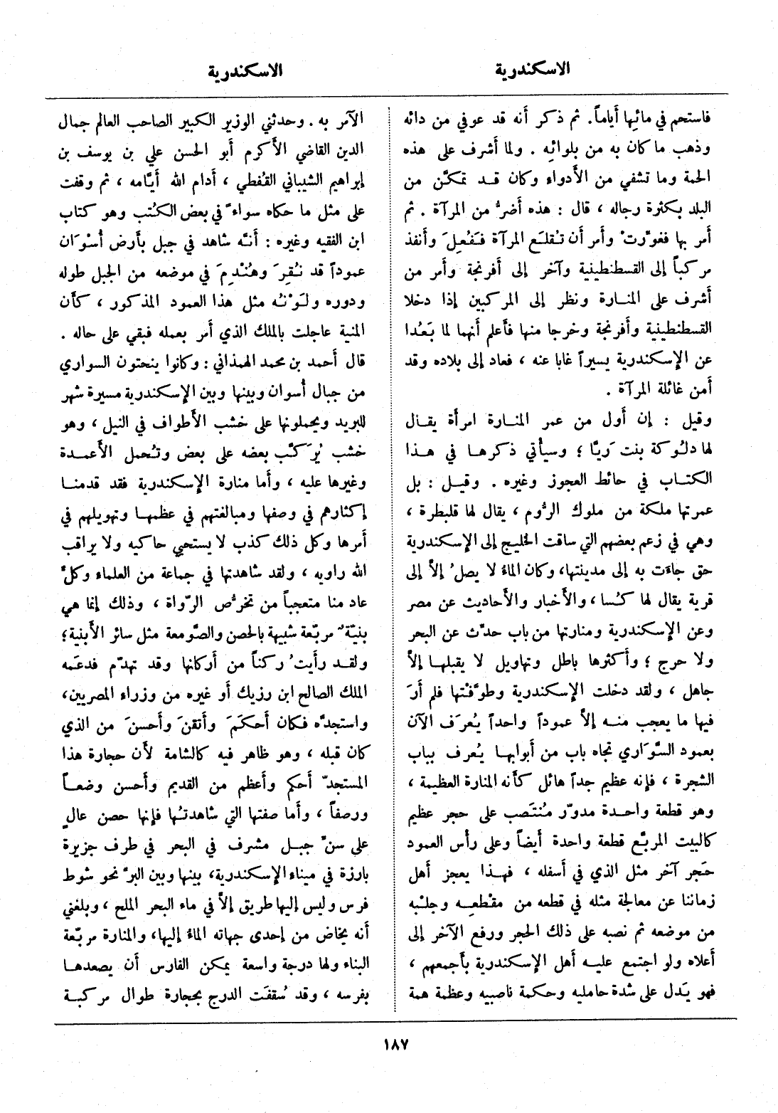 قال أحمد بن محمد الهمذاني: وكانوا ينحتون السواري من جبال أسوان وبينها وبين الإسكندرية مسيرة شهر للبريد ويحملونها على خشب الأطواف في النيل، وهو خشب يركّب بعضه على بعض وتحمل الأعمدة وغيرها عليه، وأما منارة الإسكندرية فقد قدمنا إكثارهم في وصفها ومبالغتهم في عظمها وتهويلهم في أمرها وكل ذلك كذب لا يستحيي حاكيه ولا يراقب الله راويه، ولقد شاهدتها في جماعة من العلماء وكلّ عاد منا متعجبا من تخرّص الرّواة، وذلك إنما هي بنيّة مربّعة شبيهة بالحصن والصّومعة مثل سائر الأبنية، ولقد رأيت ركنا من أركانها وقد تهدّم فدعمه الملك الصالح ابن رزيك أو غيره من وزراء المصريين، واستجدّه فكان أحكم وأتقن وأحسن من الذي كان قبله، وهو ظاهر فيه كالشامة لأن حجارة هذا المستجدّ أحكم وأعظم من القديم وأحسن وضعا ورصفا، وأما صفتها التي شاهدتها فإنها حصن عال على سنّ جبل مشرف في البحر في طرف جزيرة بارزة في ميناء الإسكندرية، بينها وبين البرّ نحو شوط فرس وليس إليها طريق إلّا في ماء البحر الملح، وبلغني أنه يخاض من إحدى جهاته الماء إليها، والمنارة مربّعة البناء ولها درجة واسعة يمكن الفارس أن يصعدها بفرسه، وقد سقفت الدرج بحجارة طوال مركبة