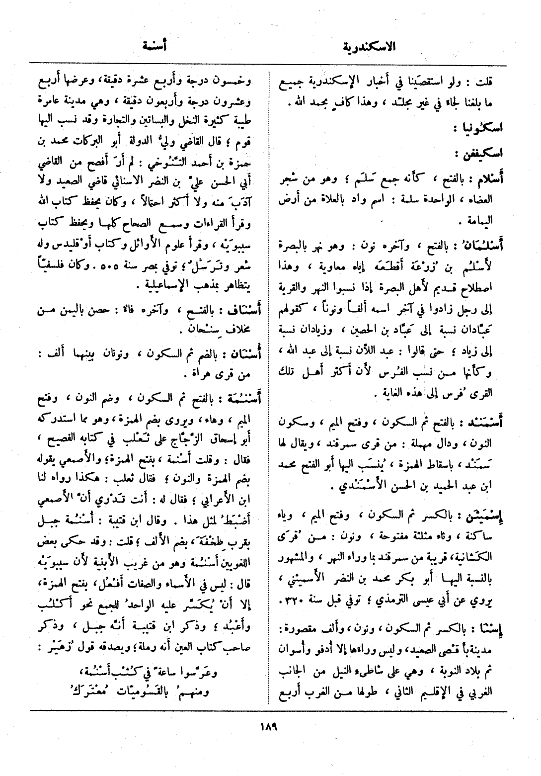 مدينة بأقصى الصعيد، وليس وراءها إلا أدفو وأسوان ثم بلاد النوبة، وهي على شاطئ النيل من الجانب الغربي في الإقليم الثاني، طولها من الغرب أربع وخمسون درجة وأربع عشرة دقيقة، وعرضها أربع وعشرون درجة وأربعون دقيقة، وهي مدينة عامرة طيبة كثيرة النخل والبساتين والتجارة وقد نسب إليها قوم، قال القاضي وليّ الدولة أبو البركات محمد بن حمزة بن أحمد التّنوخي: لم أر أفصح من القاضي أبي الحسن عليّ بن النضر الاسنائي قاضي الصعيد ولا آدب منه ولا أكثر احتمالا، وكان يحفظ كتاب الله وقرأ القراءات وسمع الصحاح كلها ويحفظ كتاب سيبويه، وقرأ علوم الأوائل وكتاب أوقليدس وله شعر وترسل، توفي بمصر سنة 505. وكان فلسفيّا يتظاهر بمذهب الإسماعيلية.