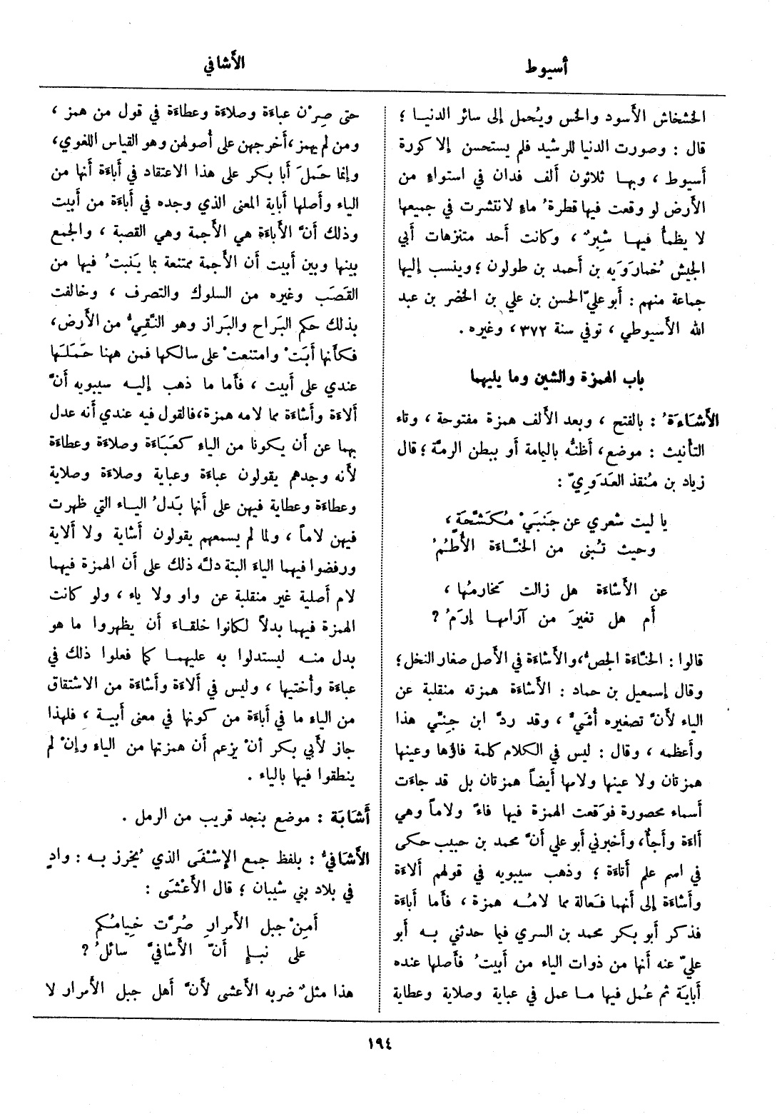 قالوا: الحنّاءة الجصّ، والأشاءة في الأصل صغار النخل، وقال إسمعيل بن حماد: الأشاءة همزته منقلبة عن الياء لأنّ تصغيره أشيّ، وقد ردّ ابن جنّي هذا وأعظمه، وقال: ليس في الكلام كلمة فاؤها وعينها همزتان ولا عينها ولامها أيضا همزتان بل قد جاءت أسماء محصورة فوقعت الهمزة فيها فاء ولاما وهي أاءة وأجأ، وأخبرني أبو علي أنّ محمد بن حبيب حكى في اسم علم أتاءة، وذهب سيبويه في قولهم ألاءة وأشاءة إلى أنهما فعالة مما لامه همزة، فأما أباءة فذكر أبو بكر محمد بن السري فيما حدثني به أبو عليّ عنه أنها من ذوات الياء من أبيت فأصلها عنده أباية ثم عمل فيها ما عمل في عباية وصلاية وعطاية حتى صرن عباءة وصلاءة وعطاءة في قول من همز، ومن لم يهمز، أخرجهن على أصولهن وهو القياس اللغوي، وإنما حمل أبا بكر على هذا الاعتقاد في أباءة أنها من الياء وأصلها أباية المعنى الذي وجده في أباءة من أبيت وذلك أنّ الأباءة هي الأجمة وهي القصبة، والجمع بينها وبين أبيت أن الأجمة ممتنعة بما ينبت فيها من القصب وغيره من السلوك والتصرف، وخالفت بذلك حكم البراح والبراز وهو النّقيّ من الأرض، فكأنها أبت وامتنعت على سالكها فمن ههنا حملها عندي على أبيت، فأما ما ذهب إليه سيبويه أنّ ألاءة وأشاءة مما لامه همزة، فالقول فيه عندي أنه عدل بهما عن أن يكونا من الياء كعباءة وصلاءة وعطاءة لأنه وجدهم يقولون عباءة وعباية وصلاءة وصلاية وعطاءة وعطاية فيهن على أنها بدل الياء التي ظهرت فيهن لاما، ولما لم يسمعهم يقولون أشاية ولا ألاية ورفضوا فيهما الياء البتة دلّه ذلك على أن الهمزة فيهما لام أصلية غير منقلبة عن واو ولا ياء، ولو كانت الهمزة فيهما بدلا لكانوا خلقاء أن يظهروا ما هو بدل منه ليستدلوا به عليهما كما فعلوا ذلك في عباءة وأختيها، وليس في ألاءة وأشاءة من الاشتقاق من الياء ما في أباءة من كونها في معنى أبية، فلهذا جاز لأبي بكر أن يزعم أن همزتها من الياء وإن لم ينطقوا فيها بالياء.