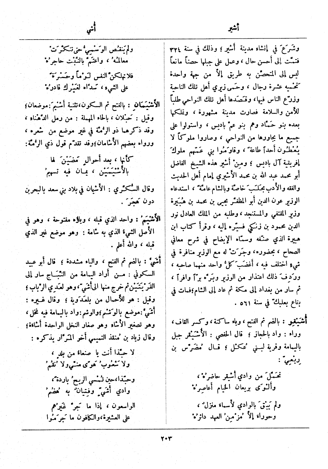 وشرع في إنشاء مدينة أشير، وذلك في سنة 324 فتمّت إلى أحسن حال، وعمل على جبلها حصنا مانعا ليس إلى المتحصّن به طريق إلّا من جهة واحدة تحميه عشرة رجال، وحمى زيري أهل تلك الناحية وزرّع الناس فيها، وقصدها أهل تلك النواحي طلبا للأمن والسلامة فصارت مدينة مشهورة، وتملكها بعده بنو حمّاد وهم بنو عمّ باديس، واستولوا على جميع ما يجاورها من النواحي، وصاروا ملوكا لا يعطون أحدا طاعة، وقاوموا بني عمّهم ملوك إفريقية آل باديس، ومن أشير هذه الشيخ الفاضل أبو محمد عبد الله بن محمد الأشيري إمام أهل الحديث والفقه والأدب بحلب خاصّة وبالشام عامّة، استدعاه الوزير عون الدين أبو المظفّر يحيى بن محمد بن هبيرة وزير المقتفي والمستنجد، وطلبه من الملك العادل نور الدين محمود بن زنكي فسيّره إليه، وقرأ كتاب ابن هبيرة الذي صنّفه وسمّاه الإيضاح في شرح معاني الصحاح، بحضوره، وجرت له مع الوزير منافرة في شيء اختلف فيه، أغضب كلّ واحد منهما صاحبه، وردف ذلك اعتذار من الوزير وبرّه برّا وافرا، ثم سار من بغداد إلى مكة ثم عاد إلى الشام، فمات في بقاع بعلبكّ في سنة 561.