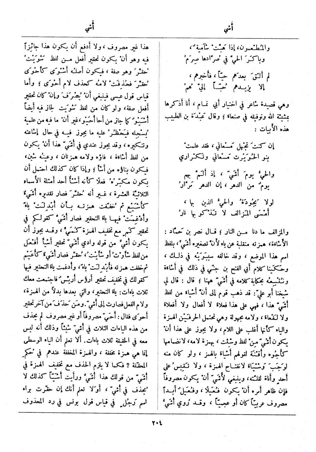 الأشاءة، همزته منقلبة عن ياء لأنّ تصغيره أشيّ، بلفظ اسم هذا الموضع، وقد خالفه سيبويه في ذلك، وحكينا كلام أبي الفتح بن جنّي في ذلك في أشاءة ونتبعه بحكاية كلامه في أشيّ ههنا، قال: قال لي شيخنا أبو عليّ: قد ذهب قوم إلى أنّ أشياء من لفظ أشيّ هذا، فهي على هذا فعلاء لا أفعال ولا أفعلاء ولا لفعاء، ولامه مجهولة وهي تحتمل الحرفين الهمزة والياء كأنها أغلب على اللام، ولا يجوز على هذا أن يكون أشيّ من لفظ وشئت، بهمزة لامه، لانضمامها كأجوه وأقنة لقولهم أشياء بالهمز، ولو كان منه لوجب وشياء لانفتاح الهمزة، ولا تقيس على أحد وأناة لقلّته، وينبغي لأشيّ أن يكون مصروفا فإن ظاهر أمره أن يكون فعيلا، وفعيل أبدا مصروف عربيّا كان أو عجميّا، وقد روي أشيّ هذا غير مصروف، ولا أدفع أن يكون هذا جائزا فيه وهو أن يكون تحقير أفعل من لفظ شويت حقّر وهو صفة، فيكون أصله أشوى كأحوى حقّر فحذفت لامه كحذف لام أحوى، وأما قياس قول عيسى فينبغي أن يصرف وإن كان تحقير أفعل صفة، ولو كان من لفظ شويت لجاز فيه أيضا أشيو كما جاز من أحا أحيو، غير أنّ ما فيه من علمية يسجله فيحظر عليه ما يجوز فيه في حال إشاعته وتنكيره، وقد يجوز عندي في أشيّ هذا أن يكون من لفظ أشاءة، فاؤه ولامه همزتان، وعينه شين، فيكون بناؤه من أشأ، وإذا كان كذلك احتمل أن يكون مكبّره فعلا كأنه أشأ أحد أمثلة الأسماء الثلاثيّة العشرة، غير أنه حقّر فصار تقديره أشيء كأشيع ثم خفّفت همزته بأن أبدلت ياء وأدغمت فيها ياء التحقير فصار أشيّ كقولكم في تحقيركم مع تخفيف الهمزة كميّ، وقد يجوز أن يكون أشيّ من قوله وادي أشيّ تحقير أشيأ أفعل من لفظ شأوت أو شأيت، حقّر فصار أشيّء كأعيم ثم خففت همزته فأبدلت ياء، وأدغمت ياء التحقير فيها كقولك في تخفيف تحقير أرؤس أريّس فاجتمعت معك ثلاث ياءات: ياء التحقير، والتي بعدها بدلا من الهمزة، ولام الفعل فصارت إلى أشيّ. ومن حذف من آخر تحقير أحوى فقال: أحيّ مصروفا أو غير مصروف لم يحذف من هذه الياءات الثلاث في أشيّ شيئا وذلك أنه ليس معه في الحقيقة ثلاث ياءات. ألا تعلم أن الياء الوسطى إنما هي همزة مخففة، والهمزة المخففة عندهم في حكم المحقّقة؟ فكما لا يلزم الحذف مع تخفيف الهمزة في أشيّ من قولك هذا أشيّ ورأيت أشيّا كذلك لا يحذف في أشيّ، أو لا تعلم أنك إن حقّرت براء اسم رجل في قياس قول يونس في رد المحذوف