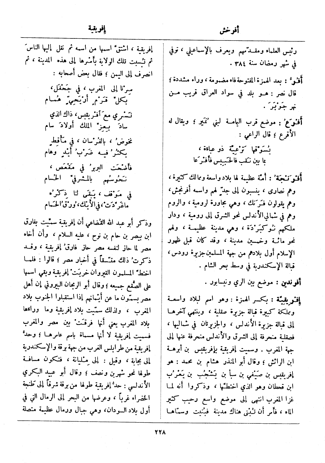 بكسر الهمزة: وهو اسم لبلاد واسعة ومملكة كبيرة قبالة جزيرة صقلية، وينتهي آخرها إلى قبالة جزيرة الأندلس، والجزيرتان في شماليها، فصقلية منحرفة إلى الشرق والأندلس منحرفة عنها إلى جهة المغرب. وسميت إفريقية بإفريقيس بن أبرهة ابن الرائش، وقال أبو المنذر هشام بن محمد: هو إفريقيس بن صيفي بن سبأ بن يشجب بن يعرب ابن قحطان وهو الذي اختطّها، وذكروا أنه لما غزا المغرب انتهى إلى موضع واسع رحيب كثير الماء، فأمر أن تبنى هناك مدينة فبنيت وسمّاها إفريقية، اشتقّ اسمها من اسمه ثم نقل إليها الناس ثم نسبت تلك الولاية بأسرها إلى هذه المدينة، ثم انصرف إلى اليمن، فقال بعض أصحابه: