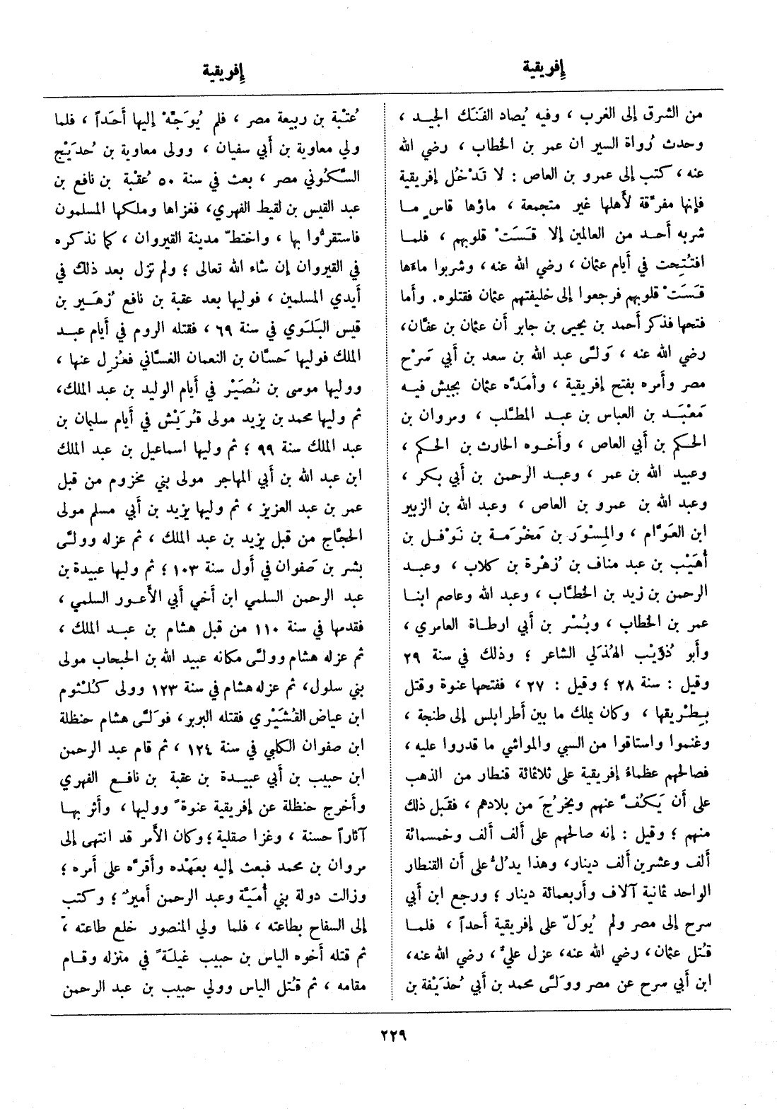 من الشرق إلى الغرب، وفيه يصاد الفنك الجيد، وحدث رواة السير ان عمر بن الخطاب، رضي الله عنه، كتب إلى عمرو بن العاص: لا تدخل إفريقية فإنها مفرّقة لأهلها غير متجمعة، ماؤها قاس ما شربه أحد من العالمين إلا قست قلوبهم، فلما افتتحت في أيام عثمان، رضي الله عنه، وشربوا ماءها قست قلوبهم فرجعوا إلى خليفتهم عثمان فقتلوه. وأما فتحها فذكر أحمد بن يحيى بن جابر أن عثمان بن عفّان، رضي الله عنه، ولّى عبد الله بن سعد بن أبي سرح مصر وأمره بفتح إفريقية، وأمدّه عثمان بجيش فيه معبد بن العباس بن عبد المطّلب، ومروان بن الحكم بن أبي العاص، وأخوه الحارث بن الحكم، وعبيد الله بن عمر، وعبد الرحمن بن أبي بكر، وعبد الله بن عمرو بن العاص، وعبد الله بن الزبير ابن العوّام، والمسور بن مخرمة بن نوفل بن أهيب بن عبد مناف بن زهرة بن كلاب، وعبد الرحمن بن زيد بن الخطّاب، وعبد الله وعاصم ابنا عمر بن الخطاب، وبسر بن أبي ارطاة العامري، وأبو ذؤيب الهذلي الشاعر، وذلك في سنة 29 وقيل: سنة 28، وقيل: 27، ففتحها عنوة وقتل بطريقها، وكان يملك ما بين أطرابلس إلى طنجة، وغنموا واستاقوا من السبي والمواشي ما قدروا عليه، فصالحهم عظماء إفريقية على ثلاثمائة قنطار من الذهب على أن يكفّ عنهم ويخرج من بلادهم، فقبل ذلك منهم، وقيل: إنه صالحهم على ألف ألف وخمسمائة ألف وعشرين ألف دينار، وهذا يدلّ على أن القنطار الواحد ثمانية آلاف وأربعمائة دينار، ورجع ابن أبي سرح إلى مصر ولم يولّ على إفريقية أحدا، فلما قتل عثمان، رضي الله عنه، عزل عليّ، رضي الله عنه، ابن أبي سرح عن مصر وولّى محمد بن أبي حذيفة بن عتبة بن ربيعة مصر، فلم يوجّه إليها أحدا، فلما ولي معاوية بن أبي سفيان، وولى معاوية بن حديج السّكوني مصر، بعث في سنة 50 عقبة بن نافع بن عبد القيس بن لقيط الفهري، فغزاها وملكها المسلمون فاستقرّوا بها، واختطّ مدينة القيروان، كما نذكره في القيروان إن شاء الله تعالى، ولم تزل بعد ذلك في أيدي المسلمين، فوليها بعد عقبة بن نافع زهير بن قيس البلوي في سنة 69، فقتله الروم في أيام عبد الملك فوليها حسّان بن النعمان الغسّاني فعزل عنها، ووليها موسى بن نصير في أيام الوليد بن عبد الملك، ثم وليها محمد بن يزيد مولى قريش في أيام سليمان بن عبد الملك سنة 99، ثم وليها إسماعيل بن عبد الملك ابن عبد الله بن أبي المهاجر مولى بني مخزوم من قبل عمر بن عبد العزيز، ثم وليها يزيد بن أبي مسلم مولى الحجّاج من قبل يزيد بن عبد الملك، ثم عزله وولّى بشر بن صفوان في أول سنة 103، ثم وليها عبيدة بن عبد الرحمن السلمي ابن أخي أبي الأعور السلمي، فقدمها في سنة 110 من قبل هشام بن عبد الملك، ثم عزله هشام وولّى مكانه عبيد الله بن الحبحاب مولى بني سلول، ثم عزله هشام في سنة 123 وولى كلثوم ابن عياض القشيري فقتله البربر، فولّى هشام حنظلة ابن صفوان الكلبي في سنة 124، ثم قام عبد الرحمن ابن حبيب بن أبي عبيدة بن عقبة بن نافع الفهري وأخرج حنظلة عن إفريقية عنوة ووليها، وأثر بها آثارا حسنة، وغزا صقلية، وكان الأمر قد انتهى إلى مروان بن محمد فبعث إليه بعهده وأقرّه على أمره، وزالت دولة بني أميّة وعبد الرحمن أمير، وكتب إلى السفاح بطاعته، فلما ولي المنصور خلع طاعته، ثم قتله أخوه الياس بن حبيب غيلة في منزله وقام مقامه، ثم قتل الياس وولي حبيب بن عبد الرحمن