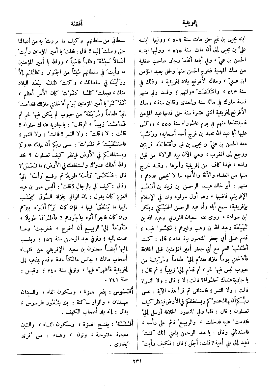 قال: فنكّس رأسه طويلا ثم رفع رأسه إليّ وقال: كيف لي بالرجال؟ قلت: أليس عمر بن عبد العزيز كان يقول: إن الوالي بمنزلة السّوق يجلب إليها ما ينفق فيها، فإن كان برّا أتوه ببرّهم وإن كان فاجرا أتوه بفجورهم؟ فأطرق طويلا، فأومأ إليّ الربيع أن أخرج، فخرجت وما عدت إليه، وتوفي عبد الرحمن سنة 156، وينسب إليها أيضا سحنون بن سعيد الإفريقي من فقهاء أصحاب مالك، جالس مالكا مدة وقدم بمذهبه إلى إفريقية فأظهره فيها، وتوفي سنة 240، وقيل: