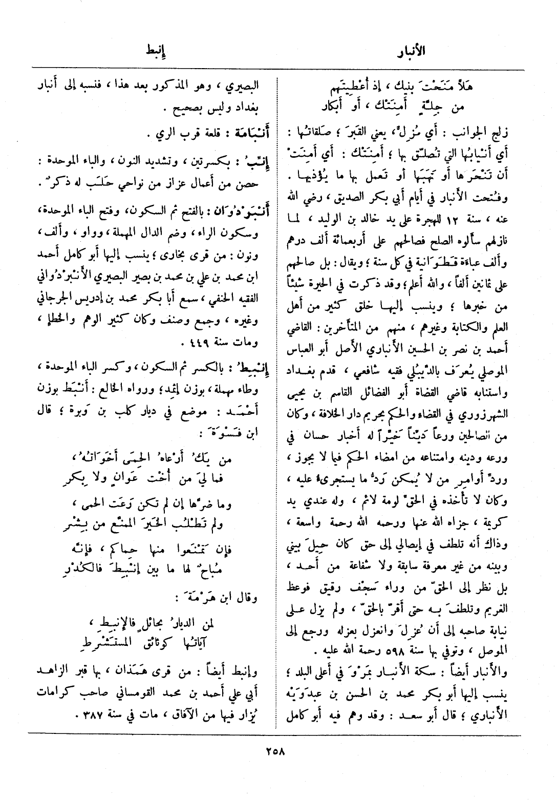 وفتحت الأنبار في أيام أبي بكر الصديق، رضي الله عنه، سنة 12 للهجرة على يد خالد بن الوليد، لما نازلهم سألوه الصلح فصالحهم على أربعمائة ألف درهم وألف عباءة قطوانية في كل سنة، ويقال: بل صالحهم على ثمانين ألفا، والله أعلم، وقد ذكرت في الحيرة شيئا من خبرها، وينسب إليها خلق كثير من أهل العلم والكتابة وغيرهم، منهم من المتأخرين: القاضي أحمد بن نصر بن الحسين الأنباري الأصل أبو العباس الموصلي يعرف بالدّيبلي فقيه شافعي، قدم بغداد واستنابه قاضي القضاة أبو الفضائل القاسم بن يحيى الشهرزوري في القضاء والحكم بحريم دار الخلافة، وكان من الصالحين ورعا ديّنا خيّرا له أخبار حسان في ورعه ودينه وامتناعه من إمضاء الحكم فيما لا يجوز، وردّ أوامر من لا يمكن ردّ ما يستجرئ عليه، وكان لا تأخذه في الحقّ لومة لائم، وله عندي يد كريمة، جزاه الله عنها ورحمه الله رحمة واسعة، وذاك أنه تلطف في إيصالي إلى حق كان حيل بيني وبينه من غير معرفة سابقة ولا شفاعة من أحد، بل نظر إلى الحقّ من وراء سجف رقيق فوعظ الغريم وتلطف به حتى أقرّ بالحقّ، ولم يزل على نيابة صاحبه إلى أن عزل وانعزل بعزله ورجع إلى الموصل، وتوفي بها سنة 598 رحمة الله عليه.