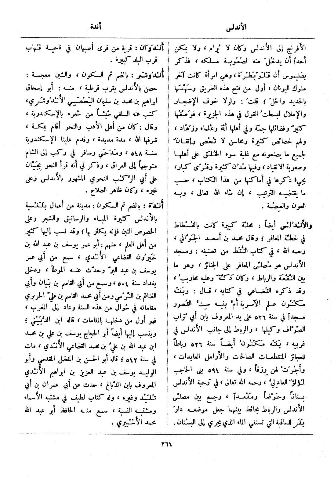 بالضم ثم السكون: مدينة من أعمال بلنسية بالأندلس كثيرة المياه والرساتيق والشجر وعلى الخصوص التين فإنه يكثر بها، وقد نسب إليها كثير من أهل العلم، منهم: أبو عمر يوسف بن عبد الله بن خيرون القضاعي الأندي، سمع من أبي عمر يوسف بن عبد البرّ وحدّث عنه الموطأ، ودخل بغداد سنة 504، وسمع من أبي القاسم بن بيان وأبي الغنائم بن النّرسي ومن أبي محمد القاسم بن عليّ الحريري مقاماته في شوال من هذه السنة وعاد إلى المغرب، فهو أول من دخلها بالمقامات، قاله ابن الدّبيثي، وينسب إليها أيضا أبو الحجاج يوسف بن علي بن محمد ابن عبد الله بن عليّ بن محمد القضاعي الأندي، مات في سنة 542، قاله أبو الحسن بن المفضل المقدسي وأبو الوليد يوسف بن عبد العزيز بن ابراهيم الأندي المعروف بابن الدّباغ، حدث عن أبي عمران بن أبي تليد وغيره، وله كتاب لطيف في مشتبه الأسماء ومشتبه النسبة، سمع منه الحافظ أبو عبد الله محمد الأشبيري.