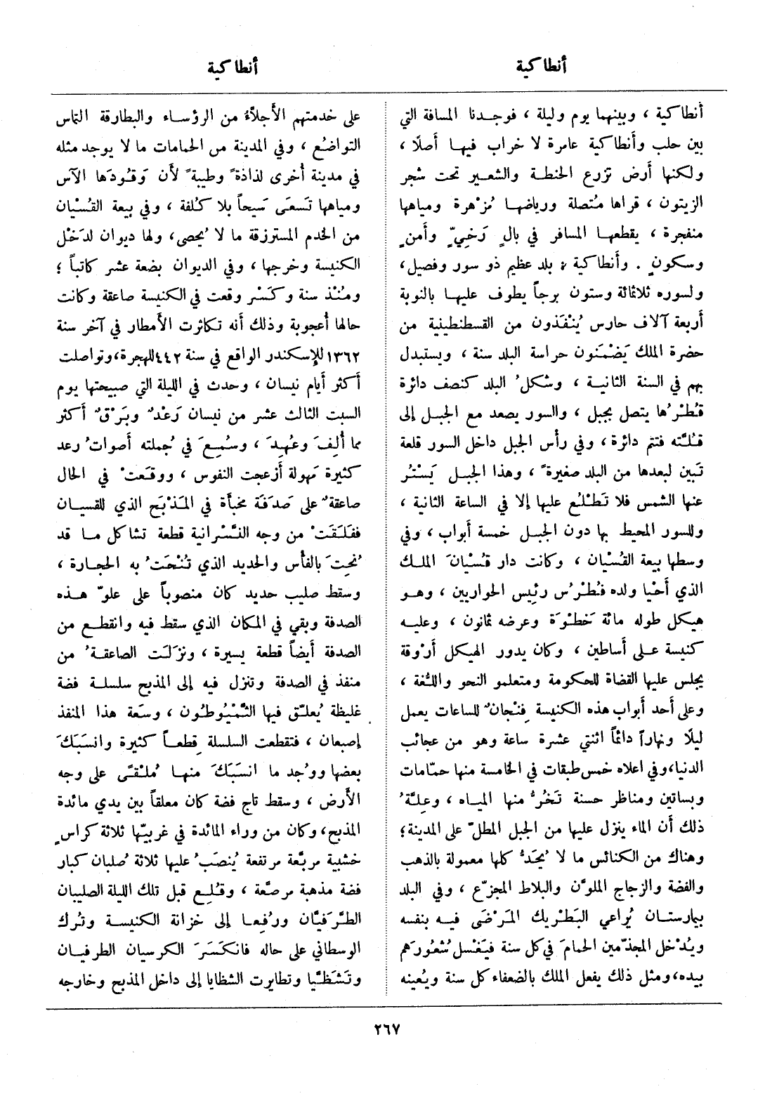 أنطاكية، وبينهما يوم وليلة، فوجدنا المسافة التي بين حلب وأنطاكية عامرة لا خراب فيها أصلا، ولكنها أرض تزرع الحنطة والشعير تحت شجر الزيتون، قراها متصلة ورياضها مزهرة ومياهها منفجرة، يقطعها المسافر في بال رخيّ وأمن وسكون. وأنطاكية: بلد عظيم ذو سور وفصيل، ولسوره ثلاثمائة وستون برجا يطوف عليها بالنوبة أربعة آلاف حارس ينفذون من القسطنطينية من حضرة الملك يضمنون حراسة البلد سنة، ويستبدل بهم في السنة الثانية، وشكل البلد كنصف دائرة قطرها يتصل بجبل، والسور يصعد مع الجبل إلى قلّته فتتم دائرة، وفي رأس الجبل داخل السور قلعة تبين لبعدها من البلد صغيرة، وهذا الجبل يستر عنها الشمس فلا تطلع عليها إلا في الساعة الثانية، وللسور المحيط بها دون الجبل خمسة أبواب، وفي وسطها بيعة القسيان، وكانت دار قسيان الملك الذي أحيا ولده فطرس رئيس الحواريين، وهو هيكل طوله مائة خطوة وعرضه ثمانون، وعليه كنيسة على أساطين، وكان يدور الهيكل أروقة يجلس عليها القضاة للحكومة ومتعلمو النحو اللّغة، وعلى أحد أبواب هذه الكنيسة فنجان للساعات يعمل ليلا ونهارا دائما اثنتي عشرة ساعة وهو من عجائب الدنيا، وفي أعلاه خمس طبقات في الخامسة منها حمّامات وبساتين ومناظر حسنة تخرّ منها المياه، وعلّة ذلك أن الماء ينزل عليها من الجبل المطلّ على المدينة، وهناك من الكنائس ما لا يحدّ كلها معمولة بالذهب والفضة والزجاج الملوّن والبلاط المجزّع، وفي البلد بيمارستان يراعي البطريك المرضى فيه بنفسه ويدخل المجذّمين الحمام في كل سنة فيغسل شعورهم بيده، ومثل ذلك يفعل الملك بالضعفاء كل سنة ويعينه على خدمتهم الأجلّاء من الرؤساء والبطارقة التماس التواضع، وفي المدينة من الحمامات ما لا يوجد مثله في مدينة أخرى لذاذة وطيبة لأن وقودها الآس ومياهها تسعى سيحا بلا كلفة، وفي بيعة القسيان من الخدم المسترزقة ما لا يحصى، ولها ديوان لدخل الكنيسة وخرجها، وفي الديوان بضعة عشر كاتبا، ومنذ سنة وكسر وقعت في الكنيسة صاعقة وكانت حالها أعجوبة وذلك أنه تكاثرت الأمطار في آخر سنة 1362 للإسكندر الواقع في سنة 442 للهجرة، وتواصلت أكثر أيام نيسان، وحدث في الليلة التي صبيحتها يوم السبت الثالث عشر من نيسان رعد وبرق أكثر مما ألف وعهد، وسمع في جملته أصوات رعد كثيرة مهولة أزعجت النفوس، ووقعت في الحال صاعقة على صدفة مخبأة في المذبح الذي للقسيان ففلقت من وجه النّسرانية قطعة تشاكل ما قد نحت بالفأس والحديد الذي تنحت به الحجارة، وسقط صليب حديد كان منصوبا على علوّ هذه الصدفة وبقي في المكان الذي سقط فيه وانقطع من الصدفة أيضا قطعة يسيرة، ونزلت الصاعقة من منفذ في الصدفة وتنزل فيه إلى المذبح سلسلة فضة غليظة يعلّق فيها الثّميوطون، وسعة هذا المنفذ إصبعان، فتقطعت السلسلة قطعا كثيرة وانسبك بعضها ووجد ما انسبك منها ملقى على وجه الأرض، وسقط تاج فضة كان معلقا بين يدي مائدة المذبح، وكان من وراء المائدة في غربيّها ثلاثة كراس خشبية مربّعة مرتفعة ينصب عليها ثلاثة صلبان كبار فضة مذهبة مرصّعة، وقلع قبل تلك الليلة الصليبان الطّرفيّان ورفعا إلى خزانة الكنيسة وترك الوسطاني على حاله فانكسر الكرسيان الطرفيان وتشظّيا وتطايرت الشظايا إلى داخل المذبح وخارجه