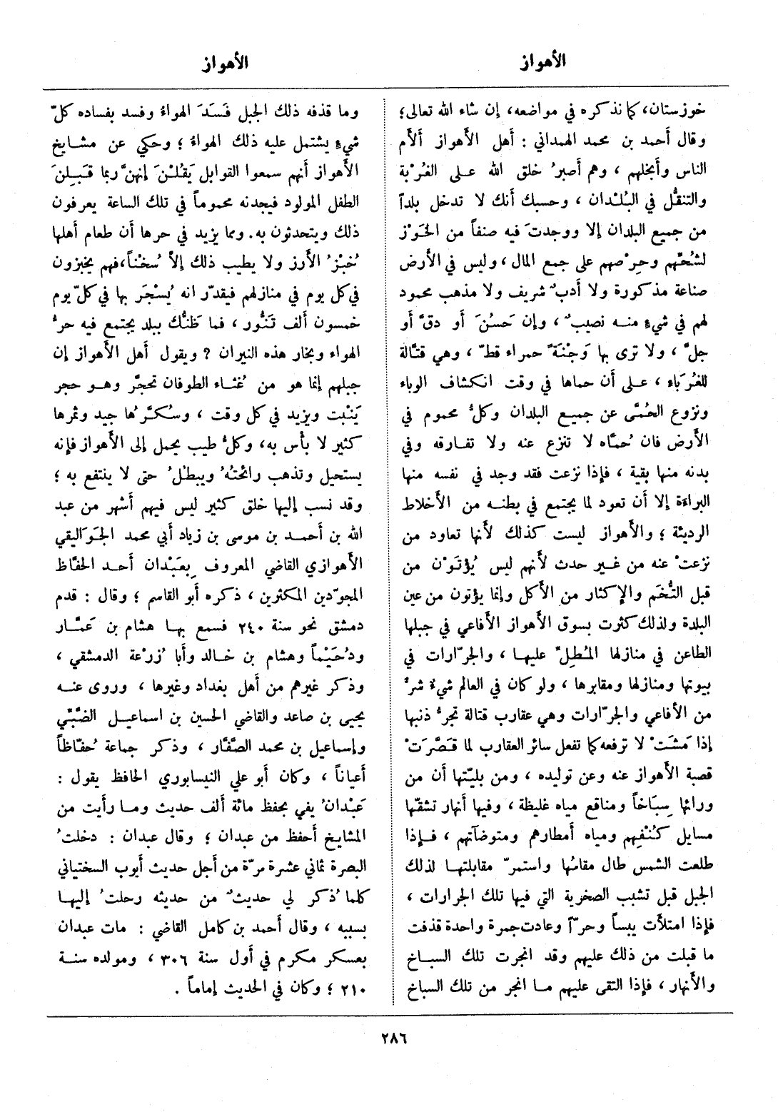 خوزستان، كما نذكره في مواضعه، إن شاء الله تعالى، وقال أحمد بن محمد الهمداني: أهل الأهواز ألأم الناس وأبخلهم، وهم أصبر خلق الله على الغربة والتنقّل في البلدان، وحسبك أنك لا تدخل بلدا من جميع البلدان إلا ووجدت فيه صنفا من الخوز لشحّهم وحرصهم على جمع المال، وليس في الأرض صناعة مذكورة ولا أدب شريف ولا مذهب محمود لهم في شيء منه نصيب، وإن حسن أو دقّ أو جلّ، ولا ترى بها وجنة حمراء قطّ، وهي قتّالة للغرباء، على أن حماها في وقت انكشاف الوباء ونزوع الحمّى عن جميع البلدان وكلّ محموم في الأرض فان حمّاه لا تنزع عنه ولا تفارقه وفي بدنه منها بقية، فإذا نزعت فقد وجد في نفسه منها البراءة إلا أن تعود لما يجتمع في بطنه من الأخلاط الرديئة، والأهواز ليست كذلك لأنها تعاود من نزعت عنه من غير حدث لأنهم ليس يؤتون من قبل التّخم والإكثار من الأكل وإنما يؤتون من عين البلدة ولذلك كثرت بسوق الأهواز الأفاعي في جبلها الطاعن في منازلها المطلّ عليها، والجرّارات في بيوتها ومنازلها ومقابرها، ولو كان في العالم شيء شرّ من الأفاعي والجرّارات وهي عقارب قتالة تجرّ ذنبها إذا مشت لا ترفعه كما تفعل سائر العقارب لما قصّرت قصبة الأهواز عنه وعن توليده، ومن بليّتها أن من ورائها سباخا ومناقع مياه غليظة، وفيها أنهار تشقّها مسايل كنفهم ومياه أمطارهم ومتوضآتهم، فإذا طلعت الشمس طال مقامها واستمرّ مقابلتها لذلك الجبل قبل تشبب الصخرية التي فيها تلك الجرارات، فإذا امتلأت يبسا وحرّا وعادت جمرة واحدة قذفت ما قبلت من ذلك عليهم وقد انجرت تلك السباخ والأنهار، فإذا التقى عليهم ما انجر من تلك السباخ وما قذفه ذلك الجبل فسد الهواء وفسد بفساده كلّ شيء يشتمل عليه ذلك الهواء، وحكي عن مشايخ الأهواز أنهم سمعوا القوابل يقلن إنهنّ ربما قبلن الطفل المولود فيجدنه محموما في تلك الساعة يعرفون ذلك ويتحدثون به. ومما يزيد في حرها أن طعام أهلها خبز الأرز ولا يطيب ذلك إلّا سخنا، فهم يخبزون في كل يوم في منازلهم فيقدّر انه يسجر بها في كلّ يوم خمسون ألف تنّور، فما ظنّك ببلد يجتمع فيه حرّ الهواء وبخار هذه النيران؟ ويقول أهل الأهواز إن جبلهم إنما هو من غثاء الطوفان تحجّر وهو حجر ينبت ويزيد في كل وقت، وسكّرها جيد وثمرها كثير لا بأس به، وكلّ طيب يحمل إلى الأهواز فإنه يستحيل وتذهب رائحته ويبطل حتى لا ينتفع به، وقد نسب إليها خلق كثير ليس فيهم أشهر من عبد الله بن أحمد بن موسى بن زياد أبي محمد الجواليقي الأهوازي القاضي المعروف بعبدان أحد الحفّاظ المجوّدين المكثرين، ذكره أبو القاسم، وقال: قدم دمشق نحو سنة 240 فسمع بها هشام بن عمّار ودحيما وهشام بن خالد وأبا زرعة الدمشقي، وذكر غيرهم من أهل بغداد وغيرها، وروى عنه يحيى بن صاعد والقاضي الحسين بن إسماعيل الضّبّي وإسماعيل بن محمد الصّفّار، وذكر جماعة حفّاظا أعيانا، وكان أبو علي النيسابوري الحافظ يقول: