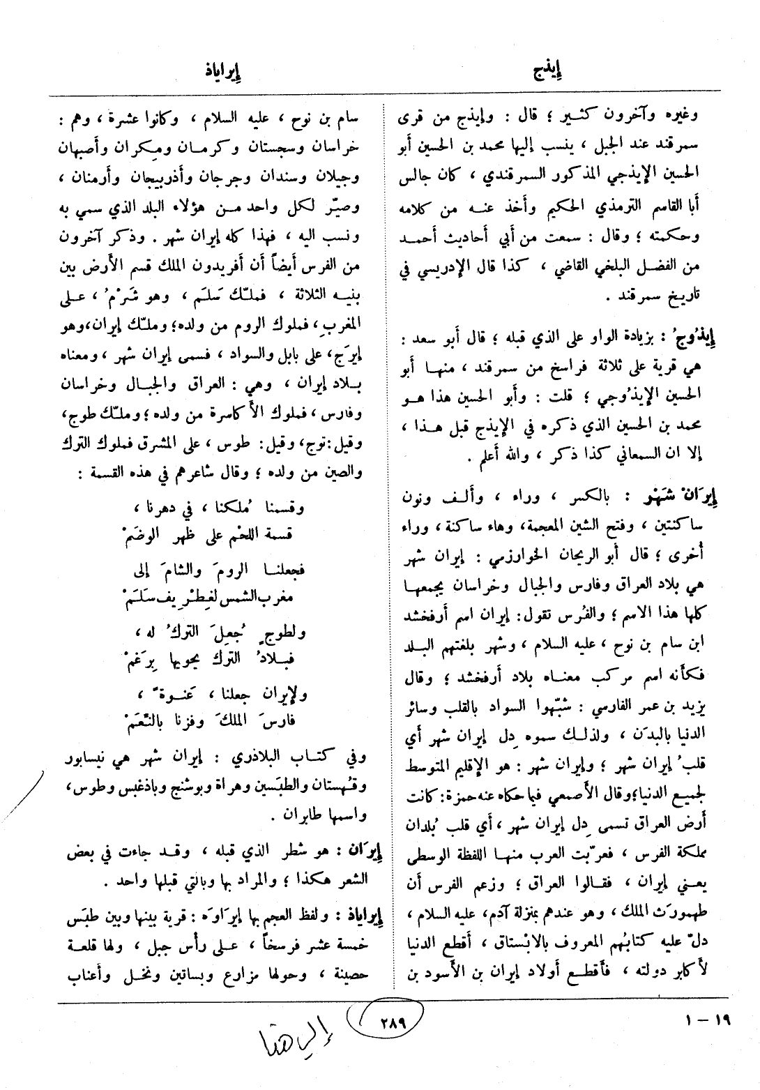 خراسان وسجستان وكرمان ومكران وأصبهان وجيلان وسندان وجرجان وأذربيجان وأرمنان، وصيّر لكل واحد من هؤلاء البلد الذي سمي به ونسب اليه، فهذا كله إيران شهر. وذكر آخرون من الفرس أيضا أن أفريدون الملك قسم الأرض بين بنيه الثلاثة، فملّك سلم، وهو شرم، على المغرب، فملوك الروم من ولده، وملّك إيران، وهو إيرج، على بابل والسواد، فسمى إيران شهر، ومعناه بلاد إيران، وهي: العراق والجبال وخراسان وفارس، فملوك الأكاسرة من ولده، وملّك طوج، وقيل: توج، وقيل: طوس، على المشرق فملوك الترك والصين من ولده، وقال شاعرهم في هذه القسمة: