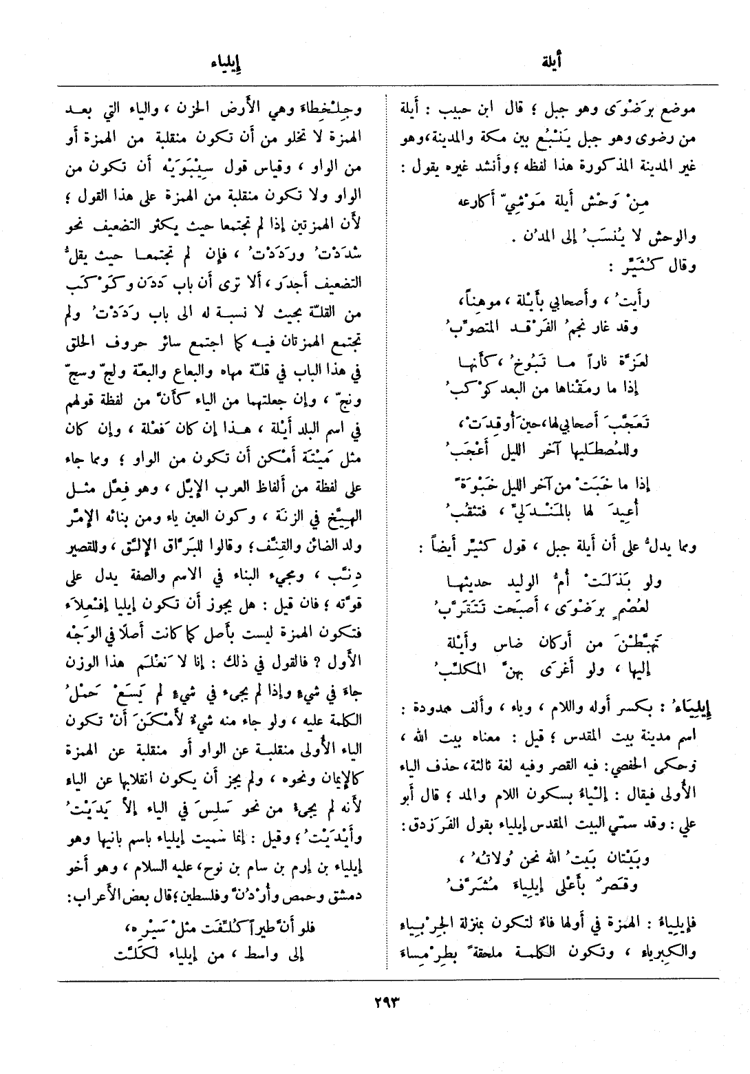 فإيلياء: الهمزة في أولها فاء لتكون بمنزلة الجربياء والكبرياء، وتكون الكلمة ملحقة بطرمساء وجلخطاء وهي الأرض الحزن، والياء التي بعد الهمزة لا تخلو من أن تكون منقلبة من الهمزة أو من الواو، وقياس قول سيبويه أن تكون من الواو ولا تكون منقلبة من الهمزة على هذا القول، لأن الهمزتين إذا لم تجتمعا حيث يكثر التضعيف نحو شددت ورددت، فإن لم تجتمعا حيث يقلّ التضعيف أجدر، ألا ترى أن باب ددن وكوكب من القلّة بحيث لا نسبة له الى باب رددت ولم تجتمع الهمزتان فيه كما اجتمع سائر حروف الحلق في هذا الباب في قلّة مهاة والبعاع والبعّة ولجّ وسجّ ونجّ، وإن جعلتهما من الياء كأنّ من لفظة قولهم في اسم البلد أيلة، هذا إن كان فعلة، وإن كان مثل ميتة أمكن أن تكون من الواو، ومما جاء على لفظة من ألفاظ العرب الإيّل، وهو فعّل مثل الهيّخ في الزنة، وكون العين ياء ومن بنائه الإمّر ولد الضائن والقنّف، وقالوا للبرّاق الإلّق، وللقصير دنّب، ومجيء البناء في الاسم والصفة يدل على قوّته، فان قيل: هل يجوز أن تكون إيليا إفعلاء فتكون الهمزة ليست بأصل كما كانت أصلا في الوجه الأول؟ فالقول في ذلك: إنا لا نعلم هذا الوزن جاء في شيء وإذا لم يجيء في شيء لم يسع حمل الكلمة عليه، ولو جاء منه شيء لأمكن أن تكون الياء الأولى منقلبة عن الواو أو منقلبة عن الهمزة كالإيمان ونحوه، ولم يجز أن يكون انقلابها عن الياء لأنه لم يجيء من نحو سلس في الياء إلّا يديت وأيديت، وقيل: إنما سميت إيلياء باسم بانيها وهو إيلياء بن إرم بن سام بن نوح، عليه السلام، وهو أخو دمشق وحمص وأردنّ وفلسطين، قال بعض الأعراب: