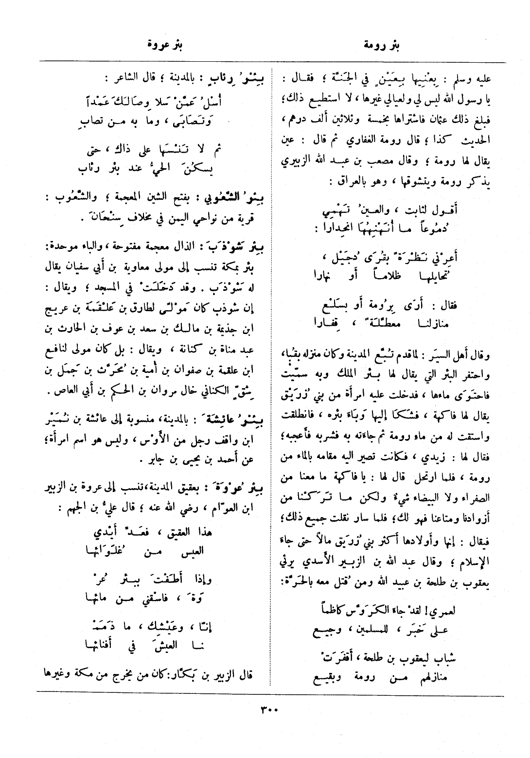 يا رسول الله ليس لي ولعيالي غيرها، لا أستطيع ذلك، فبلغ ذلك عثمان فاشتراها بخمسة وثلاثين ألف درهم، الحديث كذا، قال رومة الغفاري ثم قال: عين يقال لها رومة، وقال مصعب بن عبد الله الزبيري يذكر رومة ويتشوقها، وهو بالعراق:
