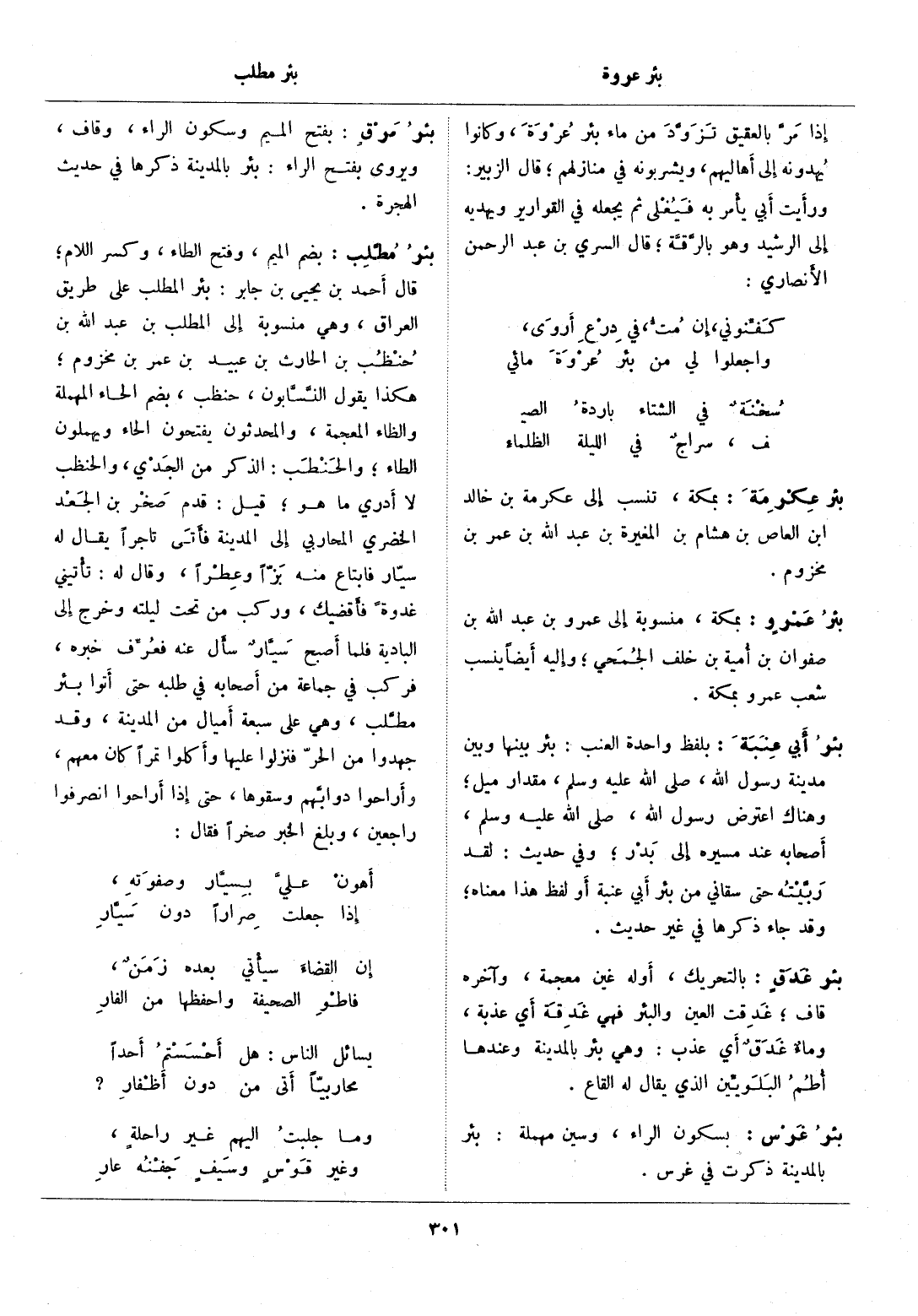 بضم الميم، وفتح الطاء، وكسر اللام، قال أحمد بن يحيى بن جابر: بئر المطلب على طريق العراق، وهي منسوبة إلى المطلب بن عبد الله بن حنظب بن الحارث بن عبيد بن عمر بن مخزوم، هكذا يقول النّسّابون، حنظب، بضم الحاء المهملة والظاء المعجمة، والمحدثون يفتحون الحاء ويهملون الطاء، والحنطب: الذكر من الجدي، والحنظب لا أدري ما هو، قيل: قدم صخر بن الجعد الحضري المحاربي إلى المدينة فأتى تاجرا يقال له سيّار فابتاع منه بزّا وعطرا، وقال له: تأتيني غدوة فأقضيك، وركب من تحت ليلته وخرج إلى البادية فلما أصبح سيّار سأل عنه فعرّف خبره، فركب في جماعة من أصحابه في طلبه حتى أتوا بئر مطّلب، وهي على سبعة أميال من المدينة، وقد جهدوا من الحرّ فنزلوا عليها وأكلوا تمرا كان معهم، وأراحوا دوابّهم وسقوها، حتى إذا أراحوا انصرفوا راجعين، وبلغ الخبر صخرا فقال: