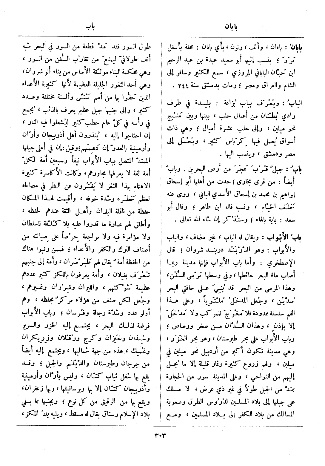 ويقال له الباب، غير مضاف، والباب والأبواب: وهو الدّربند دربند شروان، قال الإصطخري: وأما باب الأبواب فإنها مدينة ربما أصاب ماء البحر حائطها، وفي وسطها مرسى السّفن، وهذا المرسى من البحر قد بني على حافتي البحر سدّين، وجعل المدخل ملتويا، وعلى هذا الفم سلسلة ممدودة فلا مخرج للمركب ولا مدخل إلا بإذن، وهذان السّدّان من صخر ورصاص، وباب الأبواب على بحر طبرستان، وهو بحر الخزر، وهي مدينة تكون أكبر من أردبيل نحو ميلين في ميلين، ولهم زروع كثيرة وثمار قليلة إلا ما يحمل إليهم من النواحي، وعلى المدينة سور من الحجارة ممتدّ من الجبل طولا في غير ذي عرض، لا مسلك على جبلها إلى بلاد المسلمين لدروس الطرق وصعوبة المسالك من بلاد الكفر إلى بلاد المسلمين، ومع طول السور فقد مدّ قطعة من السور في البحر شبه أنف طولانيّ ليمنع من تقارب السّفن من السور، وهي محكمة البناء موثّقة الأساس من بناء أنوشروان، وهي أحد الثغور الجليلة العظيمة لأنها كثيرة الأعداء الذين حفّوا بها من أمم شتّى وألسنة مختلفة وعدد كثير، وإلى جنبها جبل عظيم يعرف بالذئب، يجمع في رأسه في كلّ عام حطب كثير ليشعلوا فيه النار، إن احتاجوا إليه، ينذرون أهل أذربيجان وأرّان وأرمينية بالعدوّ إن دهمهم، وقيل: إن في أعلى جبلها الممتدّ المتصل بباب الأبواب نيفا وسبعين أمة لكلّ أمة لغة لا يعرفها مجاورهم، وكانت الأكاسرة كثيرة الاهتمام بهذا الثغر لا يفترون عن النظر في مصالحه لعظم خطره وشدة خوفه، وأقيمت لهذا المكان حفظة من ناقلة البلدان وأهل الثقة عندهم لحفظه، وأطلق لهم عمارة ما قدروا عليه بلا كلفة للسلطان ولا مؤامرة فيه ولا مراجعة حرصا على صيانته من أصناف الترك والكفر والأعداء، فممن رتبوا هناك من الحفظة أمة يقال لهم طبرسران، وأمة إلى جنبهم تعرف بفيلان، وأمة يعرفون باللكز كثير عددهم عظيمة شوكتهم، والليران وشروان وغيرهم، وجعل لكل صنف من هؤلاء مركز يحفظه، وهم أولو عدد وشدّة رجالة وفرسان، وباب الأبواب فرضة لذلك البحر، يجتمع إليه الخزر والسرير وشنذان وخيزان وكرج ورقلان وزريكران وغميك، هذه من جهة شماليها، ويجتمع إليه أيضا من جرجان وطبرستان والدّيلم والجبل، وقد يقع بها شغل ثياب كتّان، وليس بأرّان وأرمينية وأذربيجان كتّان إلا بها وبرساتيقها، وبها زعفران، ويقع بها من الرقيق من كل نوع، وبجنبها مما يلي بلاد الإسلام رستاق يقال له مسقط، ويليه بلد اللكز،