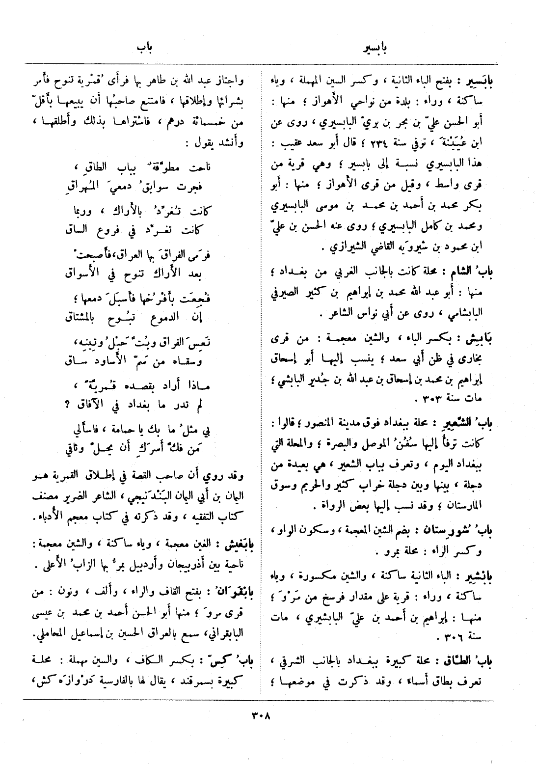 الباء الثانية ساكنة، والشين مكسورة، وياء ساكنة، وراء: قرية على مقدار فرسخ من مرو، منها: إبراهيم بن أحمد بن عليّ البابشيري، مات سنة 306.