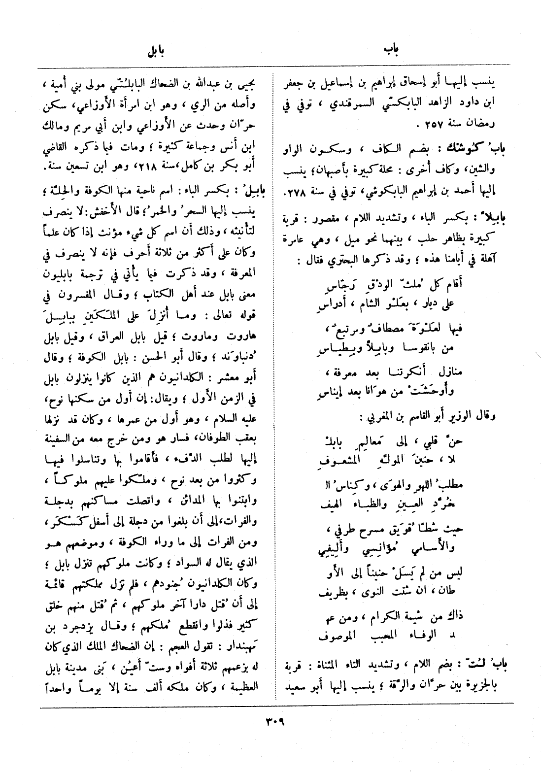 بكسر الباء: اسم ناحية منها الكوفة والحلّة، ينسب إليها السحر والخمر، قال الأخفش: لا ينصرف لتأنيثه، وذلك أن اسم كل شيء مؤنث إذا كان علما وكان على أكثر من ثلاثة أحرف فإنه لا ينصرف في المعرفة، وقد ذكرت فيما يأتي في ترجمة بابليون معنى بابل عند أهل الكتاب، وقال المفسرون في قوله تعالى: وما أنزل على الملكين ببابل هاروت وماروت، قيل بابل العراق، وقيل بابل دنباوند، وقال أبو الحسن: بابل الكوفة، وقال أبو معشر: الكلدانيون هم الذين كانوا ينزلون بابل في الزمن الأول، ويقال: إن أول من سكنها نوح، عليه السلام، وهو أول من عمرها، وكان قد نزلها بعقب الطوفان، فسار هو ومن خرج معه من السفينة إليها لطلب الدّفء، فأقاموا بها وتناسلوا فيها وكثروا من بعد نوح، وملّكوا عليهم ملوكا، وابتنوا بها المدائن، واتصلت مساكنهم بدجلة والفرات، إلى أن بلغوا من دجلة إلى أسفل كسكر، ومن الفرات إلى ما وراء الكوفة، وموضعهم هو الذي يقال له السواد، وكانت ملوكهم تنزل بابل، وكان الكلدانيون جنودهم، فلم تزل مملكتهم قائمة إلى أن قتل دارا آخر ملوكهم، ثم قتل منهم خلق كثير فذلوا وانقطع ملكهم، وقال يزدجرد بن مهبندار: تقول العجم: إن الضحاك الملك الذي كان له بزعمهم ثلاثة أفواه وستّ أعين، بنى مدينة بابل العظيمة، وكان ملكه ألف سنة إلا يوما واحدا