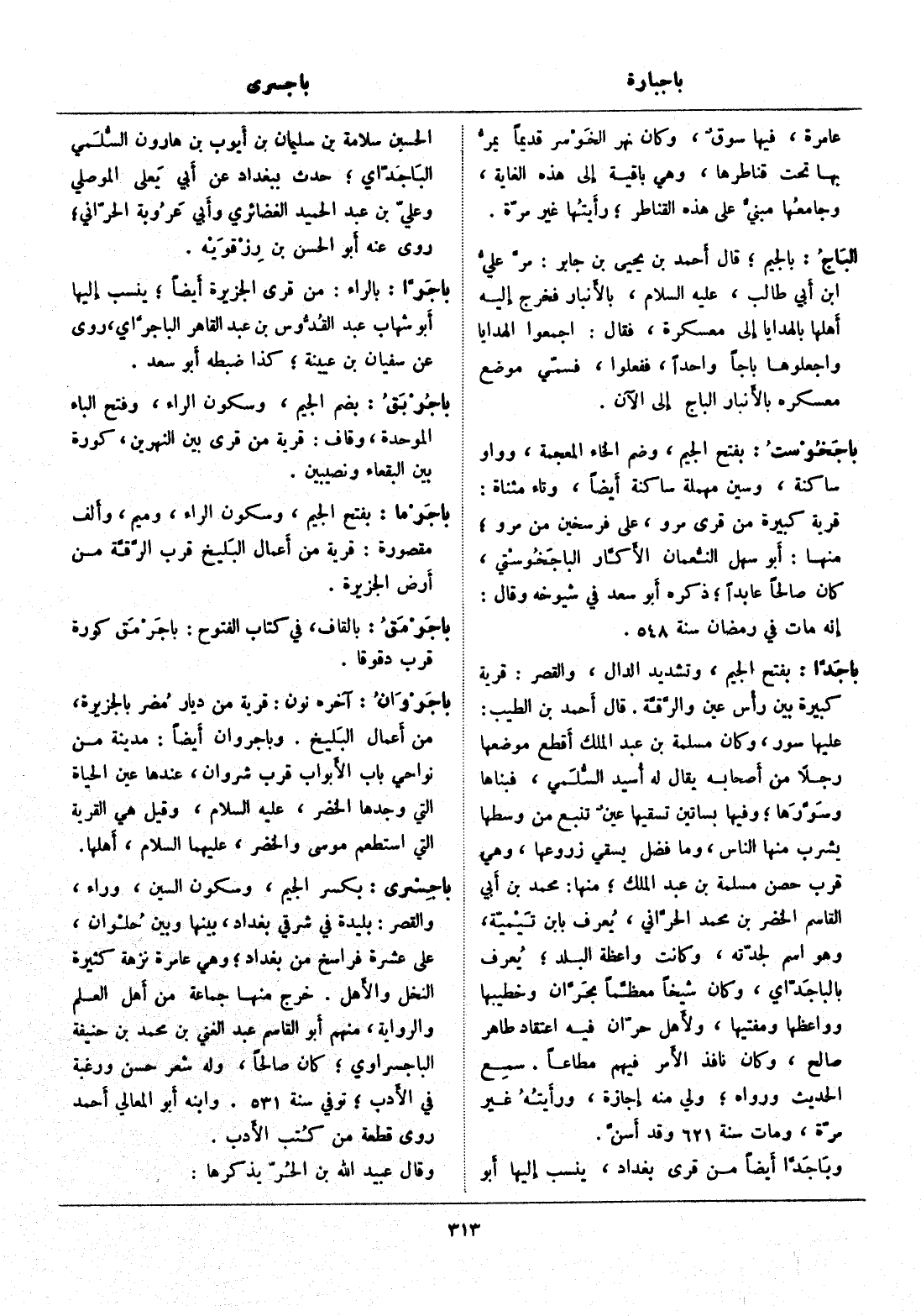 عليها سور، وكان مسلمة بن عبد الملك أقطع موضعها رجلا من أصحابه يقال له أسيد السّلمي، فبناها وسوّرها، وفيها بساتين تسقيها عين تنبع من وسطها يشرب منها الناس، وما فضل يسقي زروعها، وهي قرب حصن مسلمة بن عبد الملك، منها: محمد بن أبي القاسم الخضر بن محمد الحرّاني، يعرف بابن تيميّة، وهو اسم لجدّته، وكانت واعظة البلد، يعرف بالباجدّاي، وكان شيخا معظّما بحرّان وخطيبها وواعظها ومفتيها، ولأهل حرّان فيه اعتقاد طاهر صالح، وكان نافذ الأمر فيهم مطاعا. سمع الحديث ورواه، ولي منه إجازة، ورأيته غير مرّة، ومات سنة 621 وقد أسنّ.