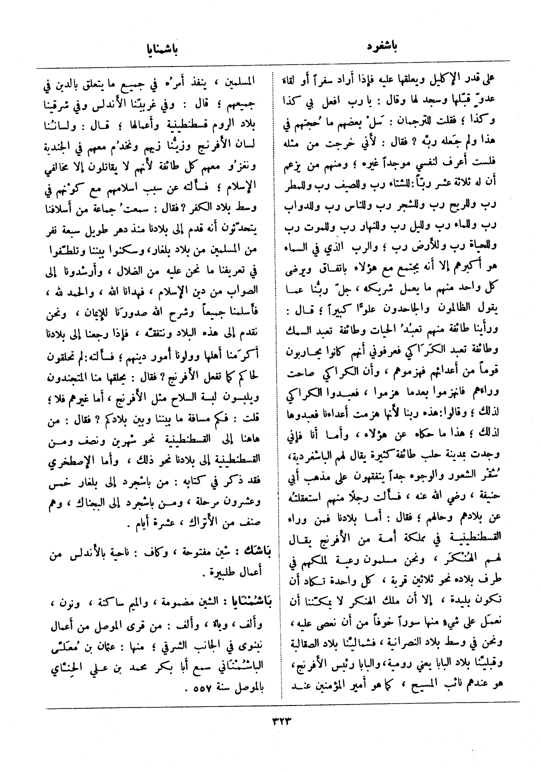 ورأينا طائفة منهم تعبد الحيات وطائفة تعبد السمك وطائفة تعبد الكراكي فعرفوني أنهم كانوا يحاربون قوما من أعدائهم فهزموهم، وأن الكراكي صاحت وراءهم فانهزموا بعد ما هزموا، فعبدوا الكراكي لذلك، وقالوا: هذه ربنا لأنها هزمت أعداءنا فعبدوها لذلك، هذا ما حكاه عن هؤلاء، وأما أنا فإني وجدت بمدينة حلب طائفة كثيرة يقال لهم الباشغردية، شقر الشعور والوجوه جدا يتفقهون على مذهب أبي حنيفة، رضي الله عنه، فسألت رجلا منهم استعقلته عن بلادهم وحالهم، فقال: أما بلادنا فمن وراء القسطنطينية في مملكة أمة من الأفرنج يقال لهم الهنكر، ونحن مسلمون رعية لملكهم في طرف بلاده نحو ثلاثين قرية، كل واحدة تكاد أن تكون بليدة، إلا أن ملك الهنكر لا يمكّننا أن نعمل على شيء منها سورا خوفا من أن نعصى عليه، ونحن في وسط بلاد النصرانية، فشماليّنا بلاد الصقالبة وقبليّنا بلاد البابا يعني رومية، والبابا رئيس الأفرنج، هو عندهم نائب المسيح، كما هو أمير المؤمنين عند المسلمين، ينفذ أمره في جميع ما يتعلق بالدين في جميعهم، قال: وفي غربيّنا الأندلس وفي شرقينا بلاد الروم قسطنطينية وأعمالها، قال: ولساننا لسان الأفرنج وزيّنا زيهم ونخدم معهم في الجندية ونغزو معهم كل طائفة لأنهم لا يقاتلون إلا مخالفي الإسلام، فسألته عن سبب إسلامهم مع كونهم في وسط بلاد الكفر؟ فقال: سمعت جماعة من أسلافنا يتحدّثون أنه قدم إلى بلادنا منذ دهر طويل سبعة نفر من المسلمين من بلاد بلغار، وسكنوا بيننا وتلطّفوا في تعريفنا ما نحن عليه من الضلال، وأرشدونا إلى الصواب من دين الإسلام، فهدانا الله، والحمد لله، فأسلمنا جميعا وشرح الله صدورنا للإيمان، ونحن نقدم إلى هذه البلاد ونتفقّه، فإذا رجعنا إلى بلادنا أكرمنا أهلها وولونا أمور دينهم، فسألته: لم تحلقون لحاكم كما تفعل الأفرنج؟ فقال: يحلقها منا المتجندون ويلبسون لبسة السلاح مثل الأفرنج، أما غيرهم فلا، قلت: فكم مسافة ما بيننا وبين بلادكم؟ فقال: من هاهنا إلى القسطنطينية نحو شهرين ونصف ومن القسطنطينية إلى بلادنا نحو ذلك، وأما الإصطخري فقد ذكر في كتابه: من باشجرد إلى بلغار خمس وعشرون مرحلة، ومن باشجرد إلى البجناك، وهم صنف من الأتراك، عشرة أيام.