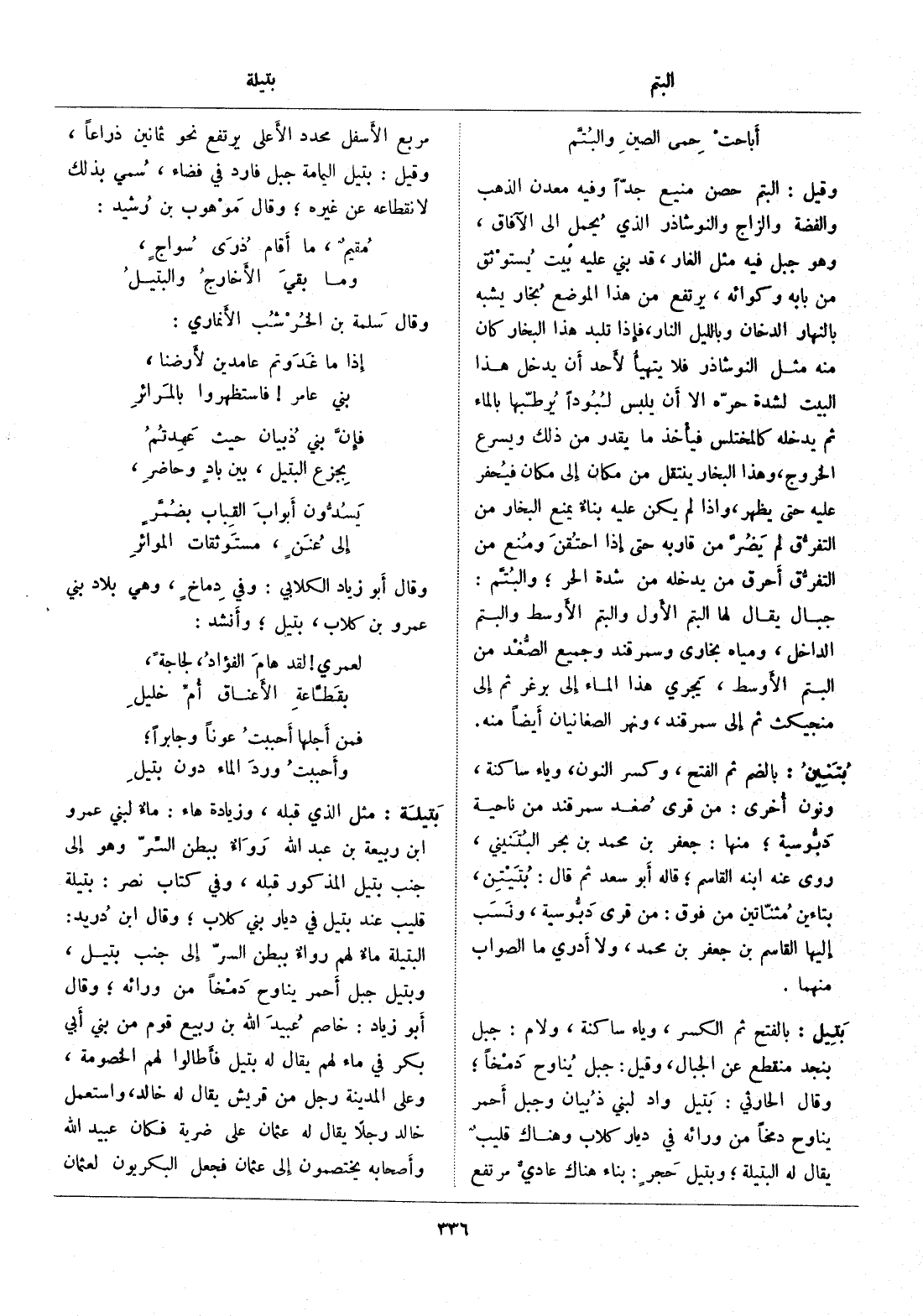 وقيل: البتم حصن منيع جدّا وفيه معدن الذهب والفضة والزاج والنوشاذر الذي يحمل الى الآفاق، وهو جبل فيه مثل الغار، قد بني عليه بيت يستوثق من بابه وكوائه، يرتفع من هذا الموضع بخار يشبه بالنهار الدخان وبالليل النار، فإذا تلبد هذا البخار كان منه مثل النوشاذر فلا يتهيأ لأحد أن يدخل هذا البيت لشدة حرّه الا أن يلبس لبودا يرطّبها بالماء ثم يدخله كالمختلس فيأخذ ما يقدر من ذلك ويسرع الخروج، وهذا البخار ينتقل من مكان إلى مكان فيحفر عليه حتى يظهر، وإذا لم يكن عليه بناء يمنع البخار من التفرّق لم يضرّ من قاربه حتى إذا احتقن ومنع من التفرّق أحرق من يدخله من شدة الحر، والبتّم: