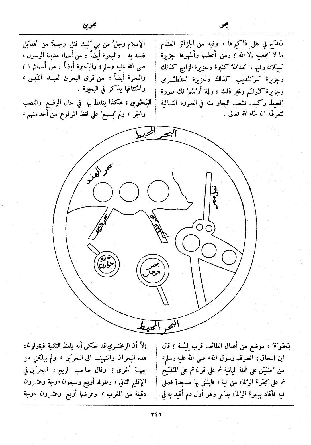 تقدح في عقل ذاكرها، وفيه من الجزائر العظام ما لا يحصيه إلا الله، ومن أعظمها وأشهرها جزيرة سيلان وفيها مدن كثيرة وجزيرة الزابج كذلك وجزيرة سرنديب كذلك وجزيرة سقطرى وجزيرة كولم وغير ذلك، وإنما أرسم لك صورة المحيط وكيف تشعب البحار منه في الصورة التالية لتعرفه ان شاء الله تعالى.