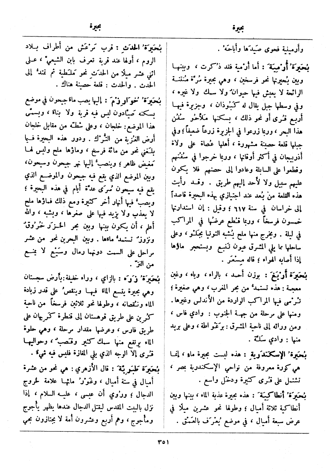 إليها يصب ماء جيحون في موضع يسكنه صيّادون ليس فيه قرية ولا بناء، ويسمّى هذا الموضع: خلجان، وعلى شطّه من مقابل خلجان أرض الغزية من التّرك. ودور هذه البحيرة فيما بلغني نحو من مائة فرسخ، وماؤها ملح وليس لها مغيض ظاهر، وينصبّ إليها نهر جيحون وسيحون، وبين الموضع الذي يقع فيه جيحون والموضع الذي يقع فيه سيحون سرى عدّة أيام في هذه البحيرة، ويصبّ فيها أنهار أخر كثيرة ومع ذلك فماؤها ملح لا يعذب ولا يزيد فيها على صغرها، ويشبه، والله أعلم، أن يكون بينها وبين بحر الخزر خروق ونزوز تستمدّ ماءها. وبين البحرين نحو من عشر مراحل على السمت دونهما رمال وسيع لا يمنع من النزّ.