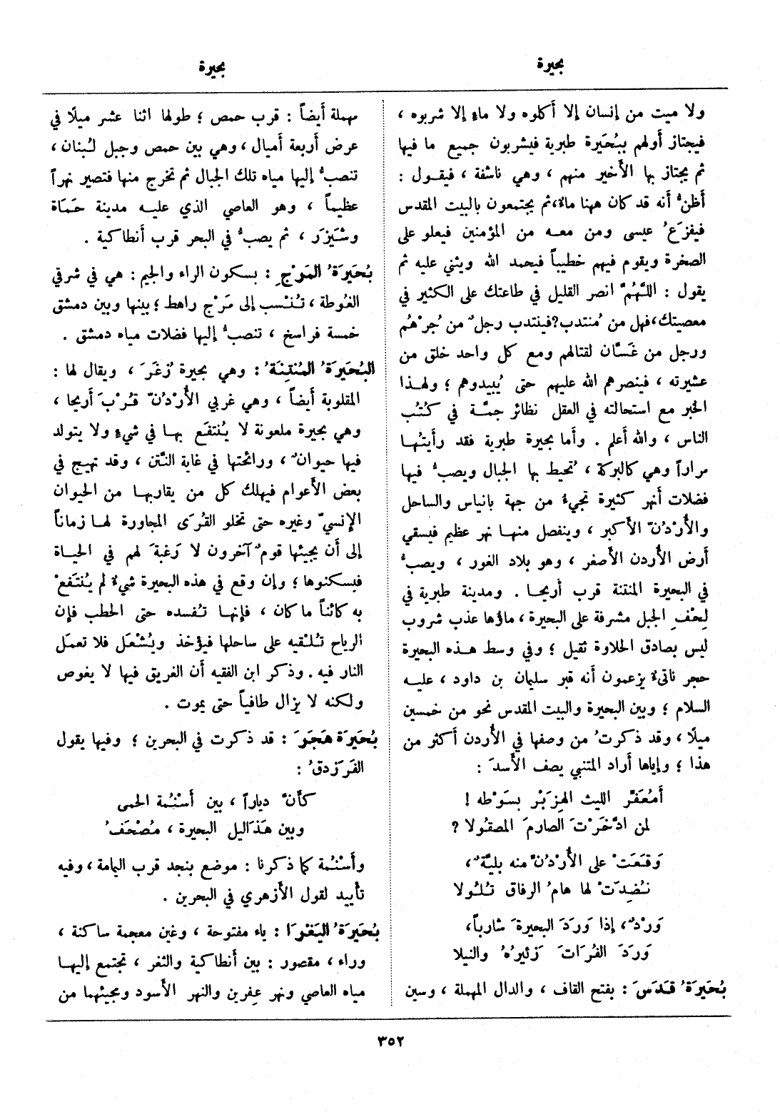 أظنّ أنه قد كان ههنا ماء، ثم يجتمعون بالبيت المقدس فيفزع عيسى ومن معه من المؤمنين فيعلو على الصخرة ويقوم فيهم خطيبا فيحمد الله ويثني عليه ثم يقول: اللهمّ انصر القليل في طاعتك على الكثير في معصيتك، فهل من منتدب؟ فينتدب رجل من جرهم ورجل من غسّان لقتالهم ومع كل واحد خلق من عشيرته، فينصرهم الله عليهم حتى يبيدوهم، ولهذا الخبر مع استحالته في العقل نظائر جمّة في كتب الناس، والله أعلم. وأما بحيرة طبرية فقد رأيتها مرارا وهي كالبركة، تحيط بها الجبال ويصبّ فيها فضلات أنهر كثيرة تجيء من جهة بانياس والساحل والأردنّ الأكبر، وينفصل منها نهر عظيم فيسقي أرض الأردن الأصغر، وهو بلاد الغور، ويصبّ في البحيرة المنتنة قرب أريحا. ومدينة طبرية في لحف الجبل مشرفة على البحيرة، ماؤها عذب شروب ليس بصادق الحلاوة ثقيل، وفي وسط هذه البحيرة حجر ناتئ يزعمون أنه قبر سليمان بن داود، عليه السلام، وبين البحيرة والبيت المقدس نحو من خمسين ميلا، وقد ذكرت من وصفها في الأردن أكثر من هذا، وإياها أراد المتنبي يصف الأسد: