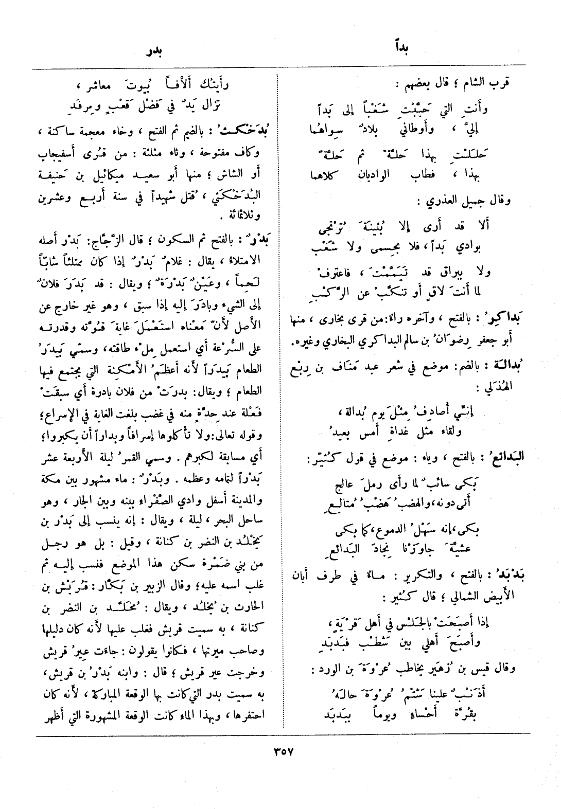 بالفتح ثم السكون، قال الزّجّاج: بدر أصله الامتلاء، يقال: غلام بدر إذا كان ممتلئا شابّا لحما، وعين بدرة، ويقال: قد بدر فلان إلى الشيء وبادر إليه إذا سبق، وهو غير خارج عن الأصل لأنّ معناه استعمل غاية قوّته وقدرته على السّرعة أي استعمل ملء طاقته، وسمّي بيدر الطعام بيدرا لأنه أعظم الأمكنة التي يجتمع فيها الطعام، ويقال: بدرت من فلان بادرة أي سبقت فعلة عند حدّة منه في غضب بلغت الغاية في الإسراع، وقوله تعالى: ولا تأكلوها إسرافا وبدارا أن يكبروا، أي مسابقة لكبرهم. وسمي القمر ليلة الأربعة عشر بدرا لتمامه وعظمه. وبدر: ماء مشهور بين مكة والمدينة أسفل وادي الصّفراء بينه وبين الجار، وهو ساحل البحر، ليلة، ويقال: إنه ينسب إلى بدر بن يخلد بن النضر بن كنانة، وقيل: بل هو رجل من بني ضمرة سكن هذا الموضع فنسب إليه ثم غلب اسمه عليه، وقال الزبير بن بكّار: قريش بن الحارث بن يخلد، ويقال: مخلّد بن النضر بن كنانة، به سميت قريش فغلب عليها لأنه كان دليلها وصاحب ميرتها، فكانوا يقولون: جاءت عير قريش وخرجت عير قريش، قال: وابنه بدر بن قريش، به سميت بدر التي كانت بها الوقعة المباركة، لأنه كان احتفرها، وبهذا الماء كانت الوقعة المشهورة التي أظهر