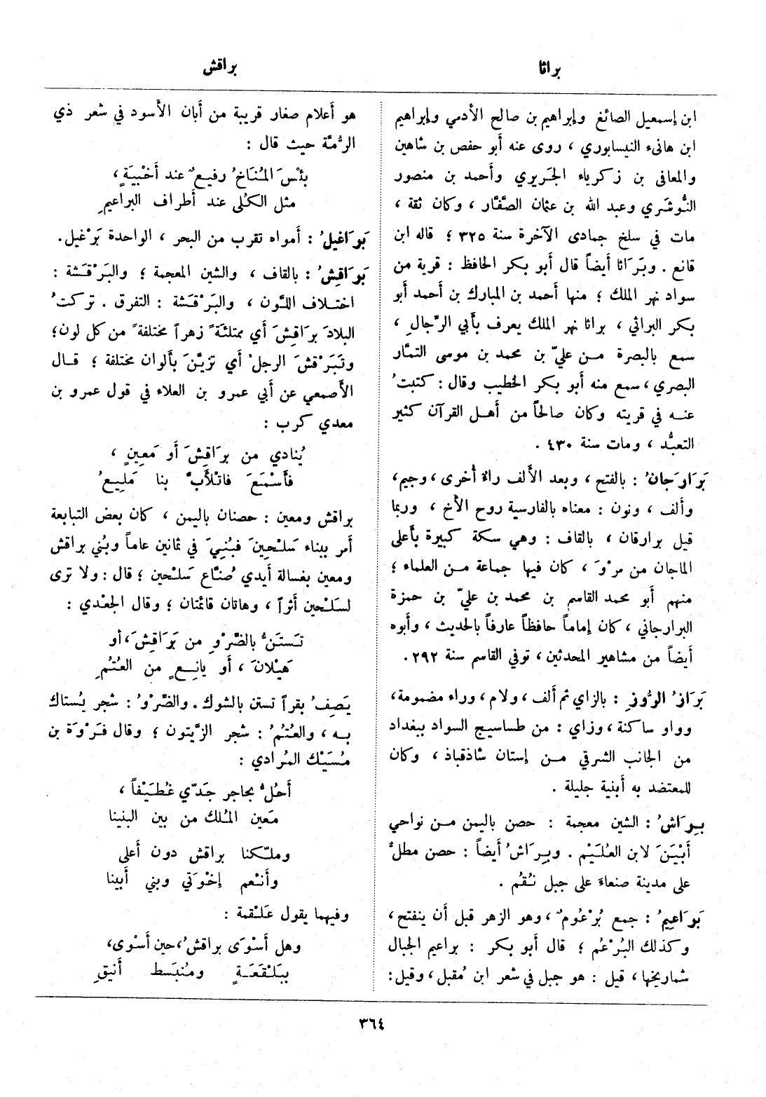 ابن إسمعيل الصائغ وإبراهيم بن صالح الأدمي وإبراهيم ابن هانئ النيسابوري، روى عنه أبو حفص بن شاهين والمعافى بن زكرياء الجريري وأحمد بن منصور النّوشري وعبد الله بن عثمان الصّفّار، وكان ثقة، مات في سلخ جمادى الآخرة سنة 325، قاله ابن قانع. وبراثا أيضا قال أبو بكر الحافظ: قرية من سواد نهر الملك، منها أحمد بن المبارك بن أحمد أبو بكر البراثي، براثا نهر الملك يعرف بأبي الرّجال، سمع بالبصرة من عليّ بن محمد بن موسى التمّار البصري، سمع منه أبو بكر الخطيب وقال: كتبت عنه في قريته وكان صالحا من أهل القرآن كثير التعبّد، ومات سنة 430.