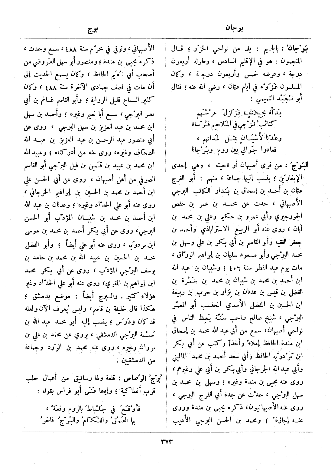 من قرى أصبهان أو ناحيته، وهي إحدى الإيغارين، ينسب إليها جماعة، منهم: أبو الفرج عثمان بن أحمد بن إسحاق بن بندار الكاتب البرجي الأصبهاني، حدث عن محمد بن عمر بن حفص الجورجيري وأبي عمرو بن حكيم وعلي بن محمد بن أبان، روى عنه أبو الربيع الاستراباذي وأحمد بن جعفر الفقيه وأبو القاسم بن أبي بكر بن علي؟ بو سهل بن محمد البرجي وأبو مسعود سليمان بن إبراهيم الورّاق، مات يوم عيد الفطر سنة 406، وشيبان بن عبد الله ابن أحمد بن محمد بن شيبان بن محمد بن سمرة بن الفضل بن قيس بن عدنان بن نزار بن حرب بن ربيعة ابن الحسين بن المفضل الأسدي المحتسب أبو المعمّر البرجي، شيخ صالح صاحب سنّة يعظ الناس في نواحي أصبهان، سمع من أبي عبد الله محمد بن إسحاق ابن مندة الحافظ إملاء وأخذا وكتب عن أبي بكر ابن مردويه الحافظ وأبي سعد أحمد بن محمد الماليني وأبي عبد الله الجرجاني وأبي بكر بن أبي علي وغيرهم، روى عنه يحيى بن مندة وغيره، وسهل بن محمد بن سهل البرجي، حدّث عن جده أبي الفرج البرجي، روى عنه الأصبهانيون، ذكره يحيى بن مندة وروى عنه إجازة، ومحمد بن الحسن البرجي الأديب الأصبهاني، وتوفي في محرّم سنة 488، سمع وحدث، ذكره يحيى بن مندة، ومنصور أبو سهل العروضي من أصحاب أبي نعيم الحافظ، وكان يسمع الحديث إلى أن مات في نصف جمادى الآخرة سنة 488، وكان كثير السماع قليل الرواية، وأبو القاسم غانم بن أبي نصر البرجي، سمع أبا نعيم وغيره، وأحمد بن سهل ابن محمد بن عبد العزيز بن سهل البرجي، روى عن أبي منصور عبد الرحمن بن عبد العزيز بن عبد الله الصحّاف وغيره، روى عنه من أدركناه، وعبيد الله ابن محمد بن عبيد بن قمن بن فيل البرجي أبو القاسم الصوفي من أهل أصبهان، روى عن أبي الحسن علي ابن أحمد بن محمد بن الحسين بن إبراهيم الخرجاني، روى عنه أبو علي الحدّاد وغيره، وعدنان بن عبد الله ابن أحمد بن محمد بن شيبان المؤدّب أبو الحسن البرجي، روى عن أبي بكر أحمد بن محمد بن موسى ابن مردويه، روى عنه أبو علي أيضا، وأبو الفضل محمد بن الحسين بن عبيد الله بن محمد بن حامد بن يوسف البرجي المؤدّب، روى عن أبي بكر محمد ابن إبراهيم بن المقري، روى عنه أبو علي الحدّاد وغير هؤلاء كثير. والبرج أيضا: موضع بدمشق، هكذا قال خليفة بن قاسم، وليس يعرف الآن ولعله قد كان ودرس، ينسب إليه أبو محمد عبد الله بن سلمة البرجي الدمشقي، يروي عن محمد بن علي بن مروان وغيره، روى عنه محمد بن الورد وجماعة من الدمشقيين.
